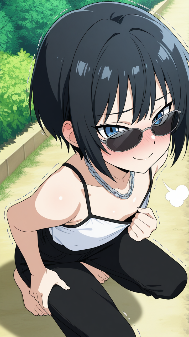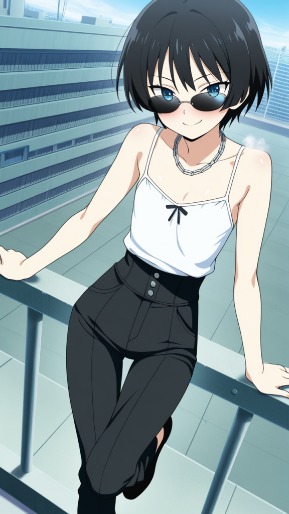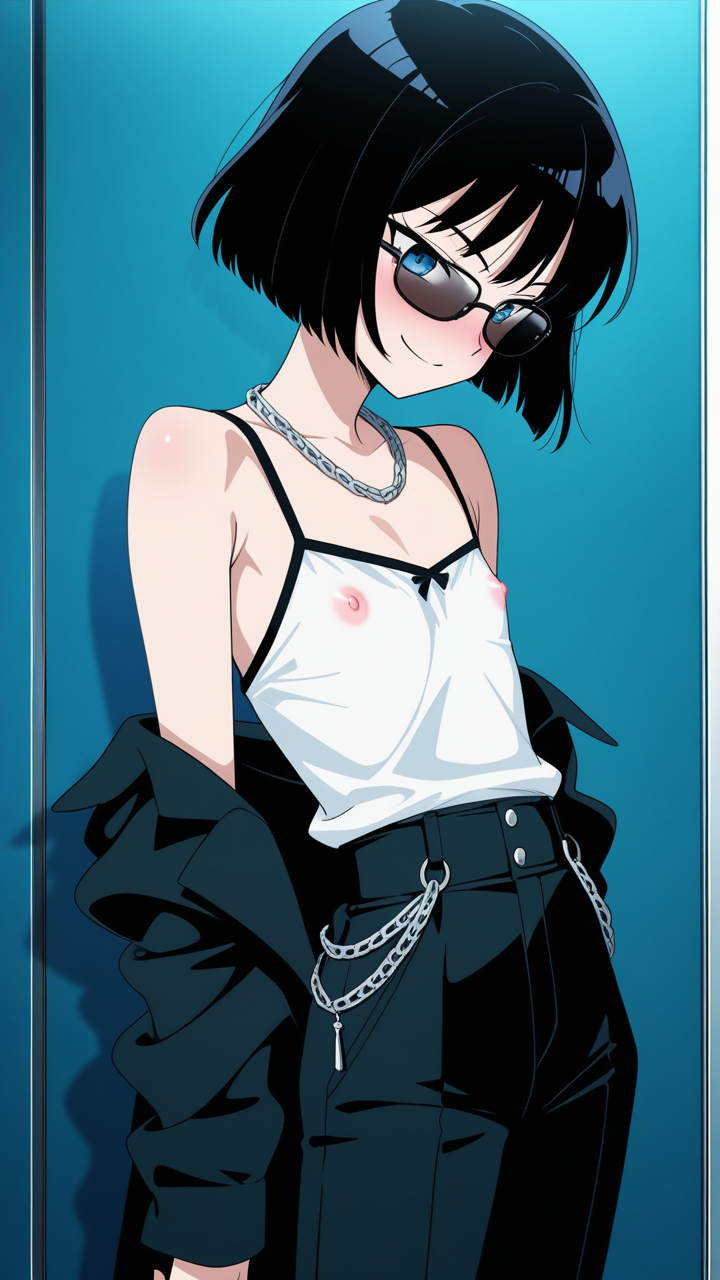 美少女,おっぱい,おしり,M字開脚,食い込み,乳首,パンツ,くぱぁ,,黒髪のショートカット,青い瞳のつり目,貧乳・長身,黒いシースルーブラウス、白いキャミソール、黒いハイウエストスキニーパンツ、黒いサングラス、シルバーのチェーンネックレス,ミステリアスでクールな雰囲気、謎めいた笑み