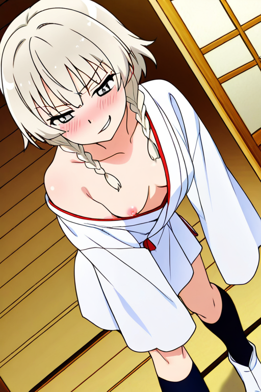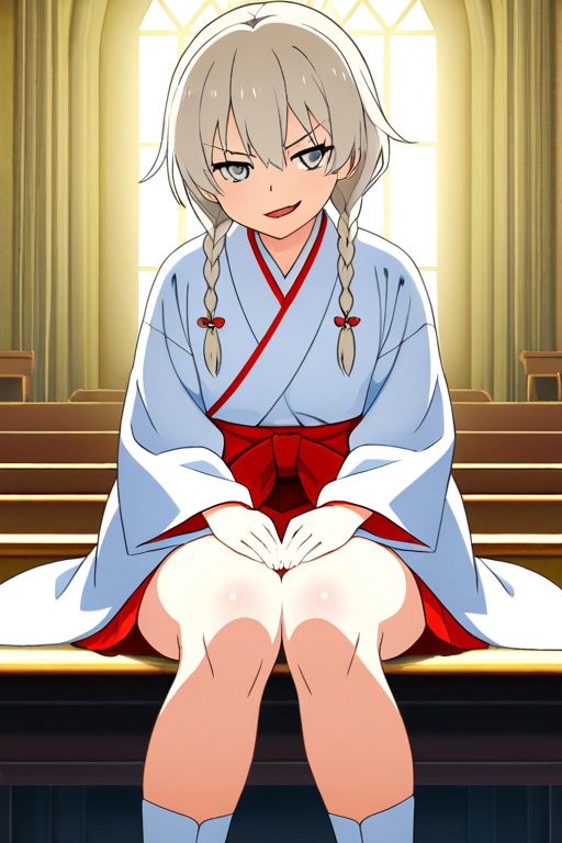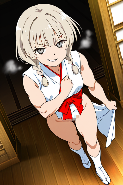 美少女,おっぱい,おしり,M字開脚,食い込み,乳首,パンツ,くぱぁ,,プラチナブロンドのツインおさげ,銀色の細めのクールな瞳,スポーティーで筋肉質な体型,紅白の巫女服、黒い足袋、白い靴,腹黒系で冷徹な笑みを浮かべている