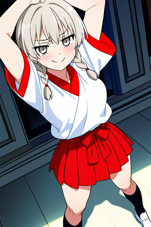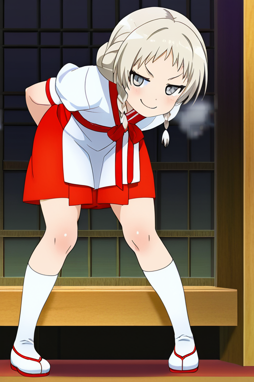 platinum blonde twin braids,silver eyes, narrow and cool expression,sporty, athletic and muscular physique,red and white shrine maiden outfit, black tabi socks, white shoes,black-hearted, cunning with a cold smirk