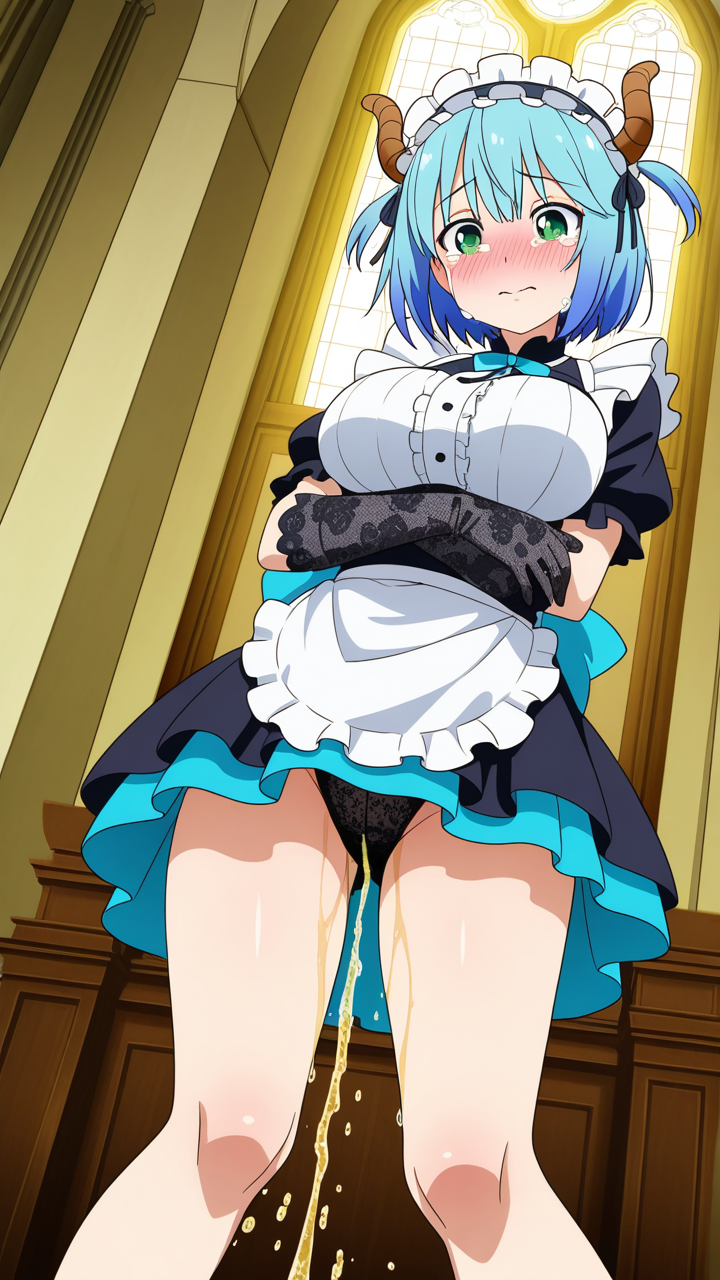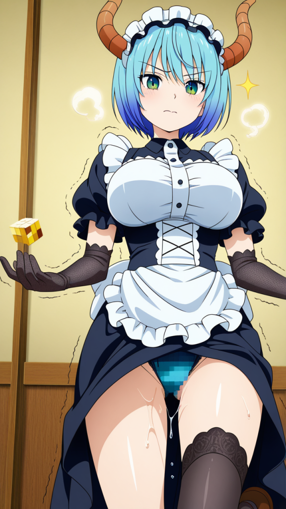 美少女,おっぱい,おしり,M字開脚,食い込み,乳首,パンツ,くぱぁ,おしっこ,お漏らし,放尿,,水色のショートカット,緑の瞳、ハーフっぽい二重,巨乳・スレンダー,黒と青のドラゴンメイド服、悪魔の角カチューシャ、黒いレース手袋,気の強いボーイッシュ、自信に満ちた表情
