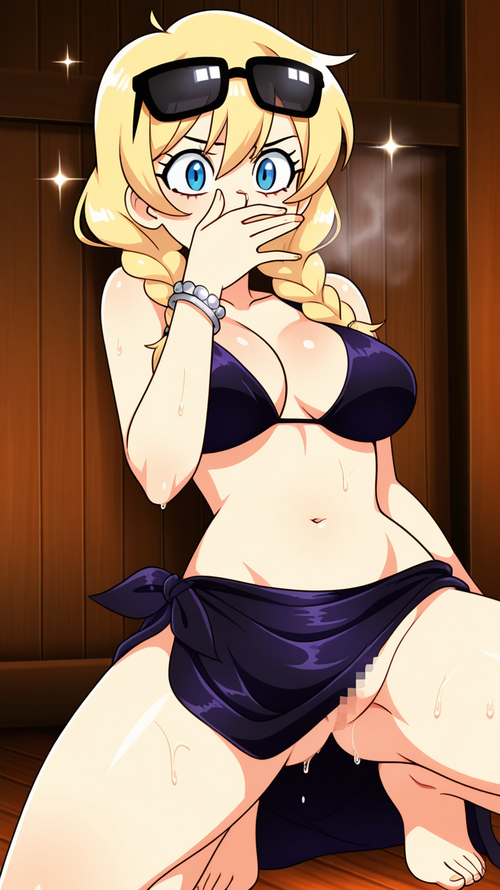 美少女,おっぱい,おしり,M字開脚,食い込み,乳首,パンツ,くぱぁ,おしっこ,お漏らし,放尿,,紫髪のツインおさげ,青い瞳のハーフっぽい二重,細身・長身モデル体型,紫と黒の和洋折衷服、黒いサングラス、腕には銀色のブレスレット,毒舌で皮肉屋、しかし本当は優しい