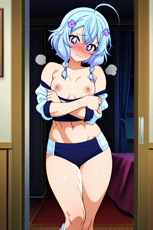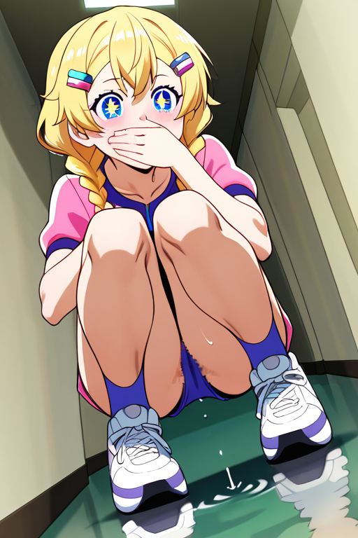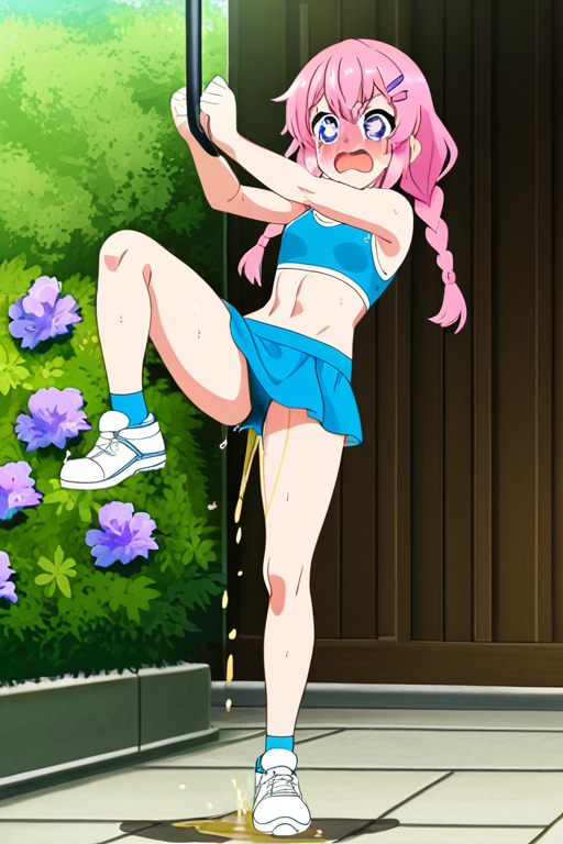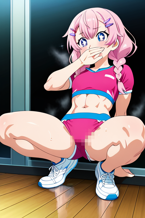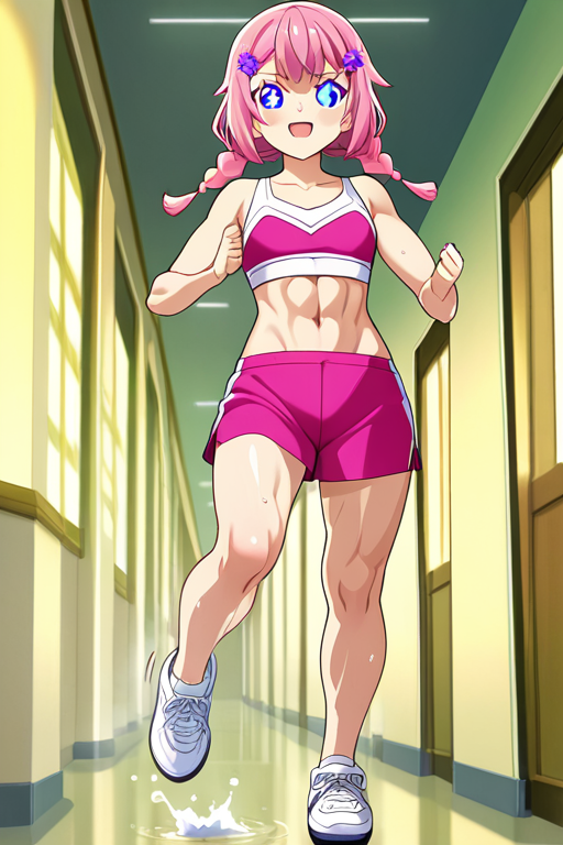 美少女,おっぱい,おしり,M字開脚,食い込み,乳首,パンツ,くぱぁ,おしっこ,お漏らし,放尿,,紫髪のツインおさげ,青い瞳の丸くてキラキラした目,スポーティー・筋肉質,黒とピンクのスポーツウェア、白いスニーカー、紫色の花飾りヘアクリップ,毒舌だが仲間思い、サバサバとした性格