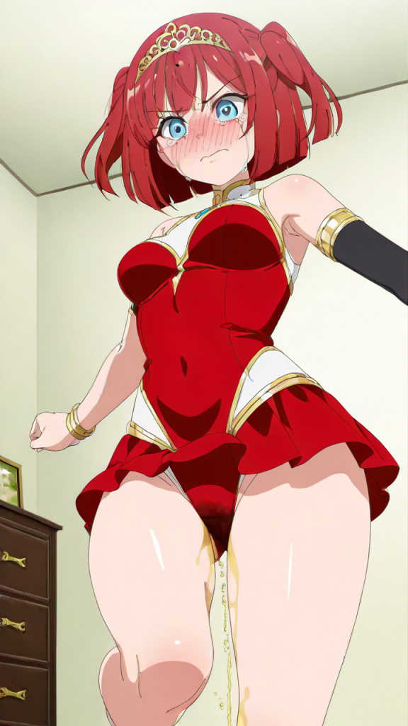 美少女,おっぱい,おしり,M字開脚,食い込み,乳首,パンツ,くぱぁ,おしっこ,お漏らし,放尿,,赤髪の外ハネボブ,水色の大きなぱっちり目,巨乳でむっちりした体型,紅白のレオタード、金色のヘッドドレス、腕には黒いアームバンド,ツンデレで気が強い