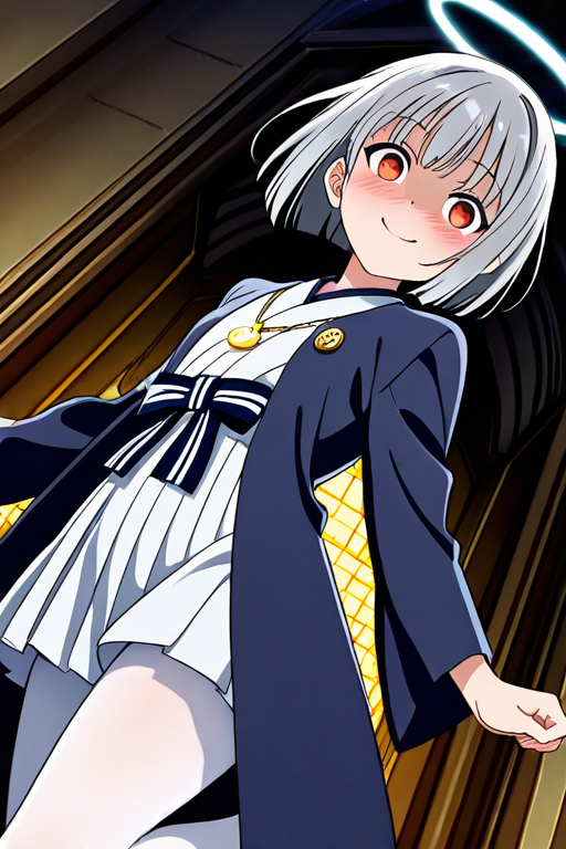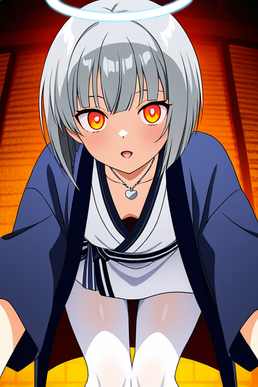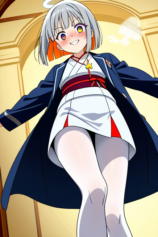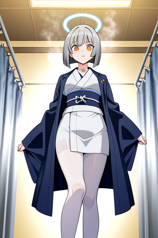 short grey hair with slightly tousled ends,amber colored eyes, narrow and cool expression,average build with soft curves,navy half-coat over white kimono, white tights, angel halo pendant on chest,yandere tendencies, obsessive and overly devoted to those she loves, intense gaze