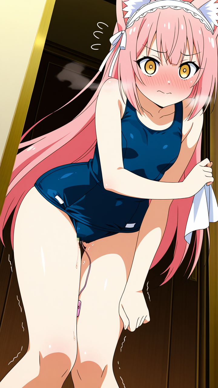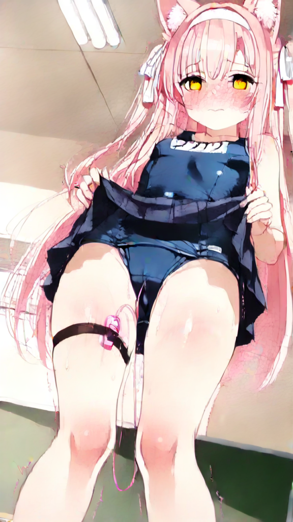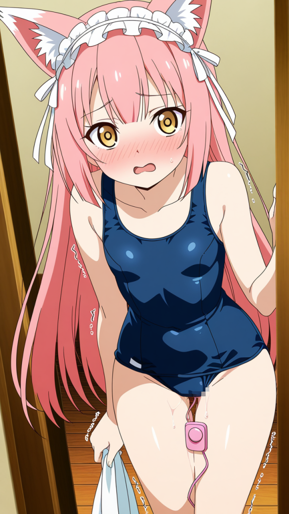 【エロ画像】AI_バイブ_ピンク髪揺らめく、狐耳美少女のスク水姿