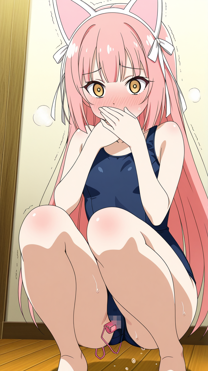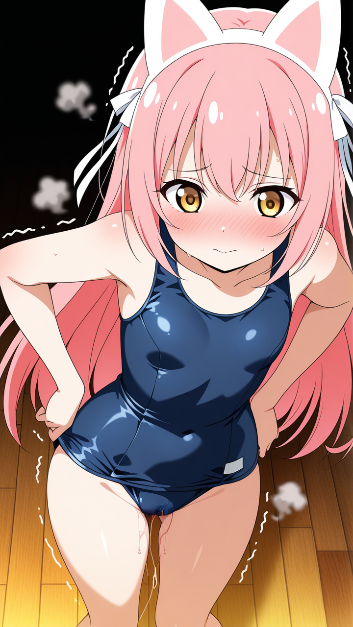 【エロ画像】AI_おしっこ_ピンク髪で弾ける、スクール水着の筋肉美少