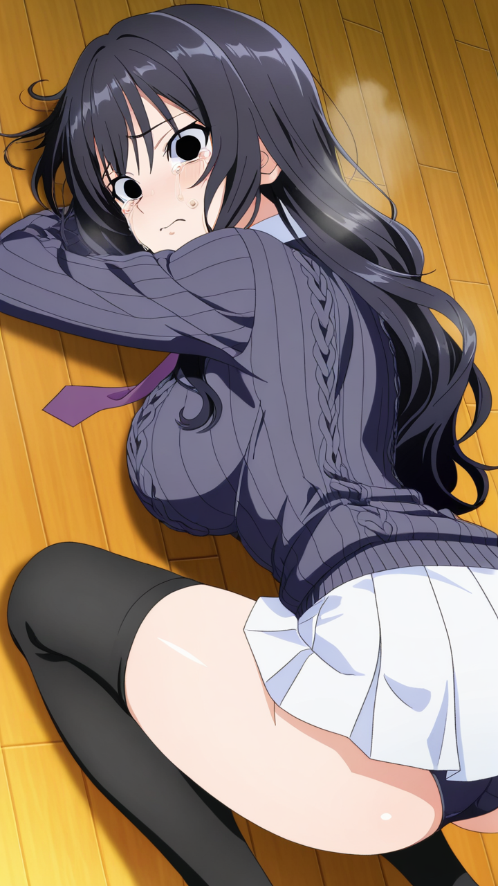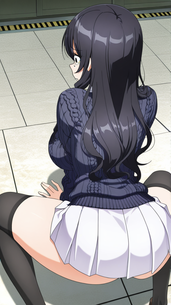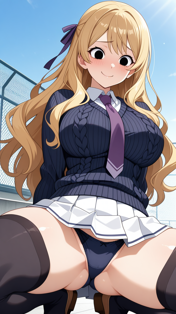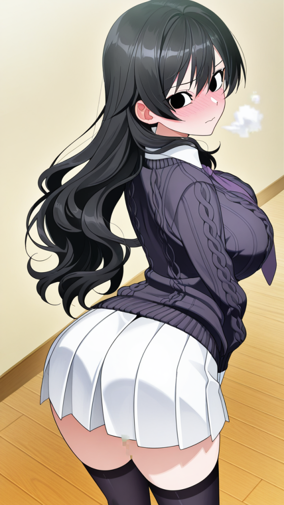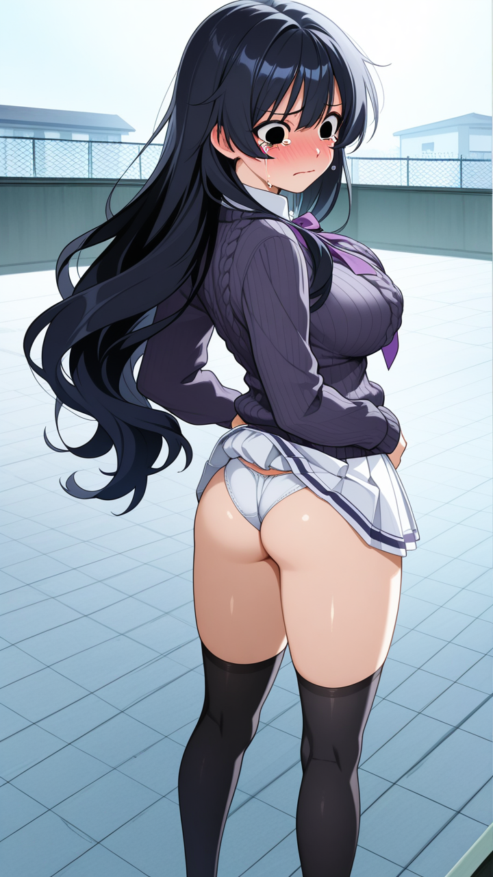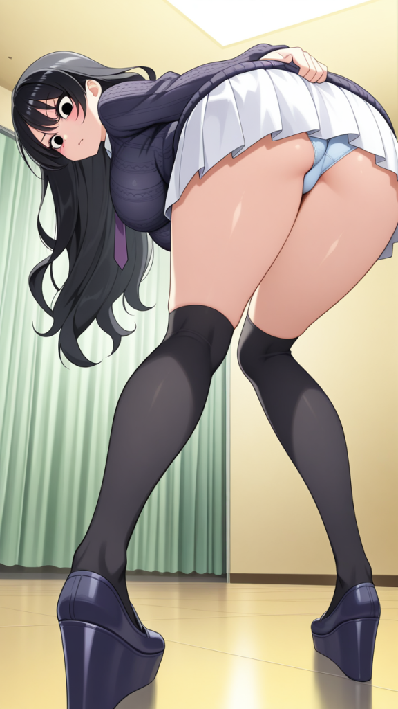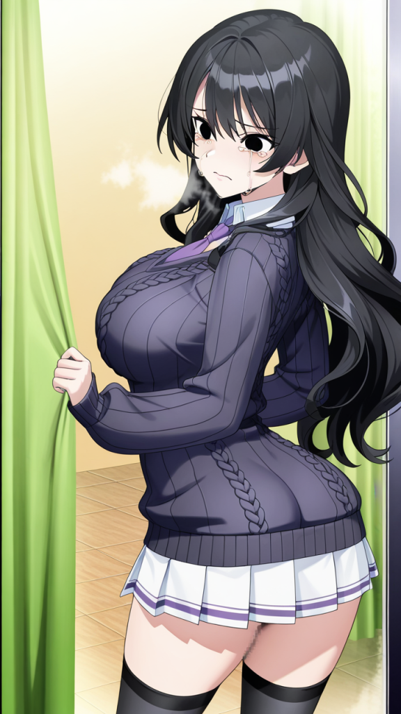 美少女,おっぱい,おしり,M字開脚,食い込み,乳首,パンツ,くぱぁ,バック,後背位,,青髪のウェーブロング,黒い瞳の切れ長の目,巨乳・スレンダー,濃紺のニットセーター、黒いニーソックス、大きな紫のリボンタイ、白いプリーツスカート,気の強いボーイッシュ、挑戦的で負けず嫌い