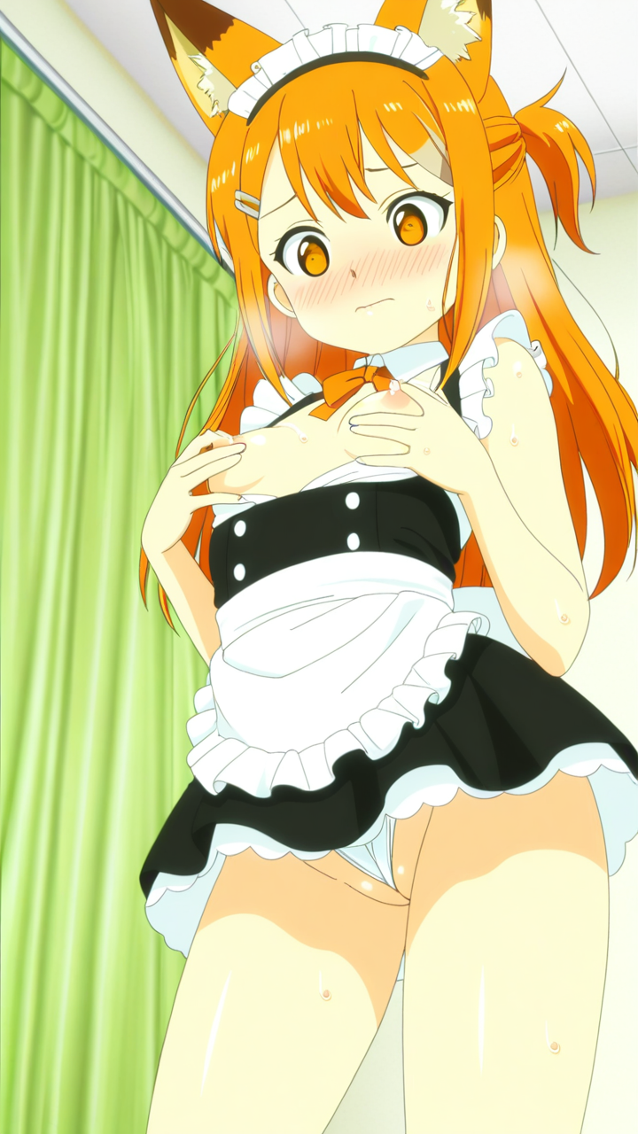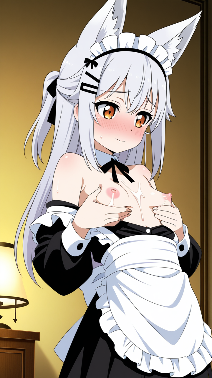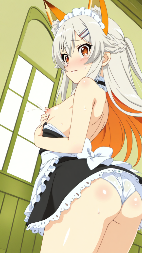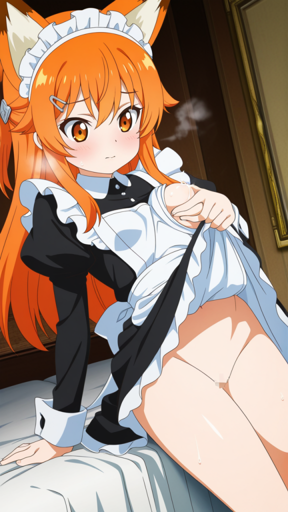 美少女,おっぱい,おしり,M字開脚,食い込み,乳首,パンツ,くぱぁ,母乳,ミルク,,オレンジ髪のハーフアップ,琥珀色の切れ長の目,ロリ体型,黒と白のメイド服、白いエプロン、狐耳カチューシャ、シルバーのヘアピン,ミステリアス