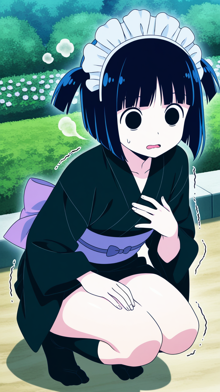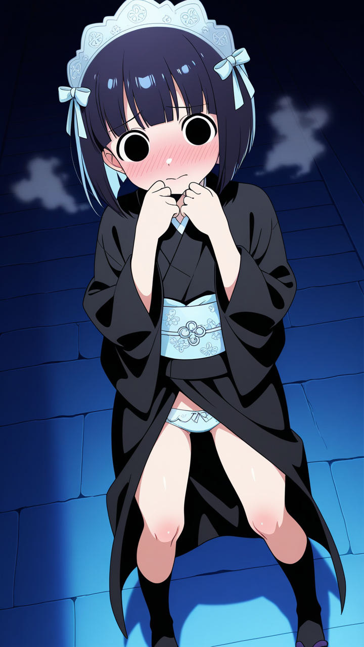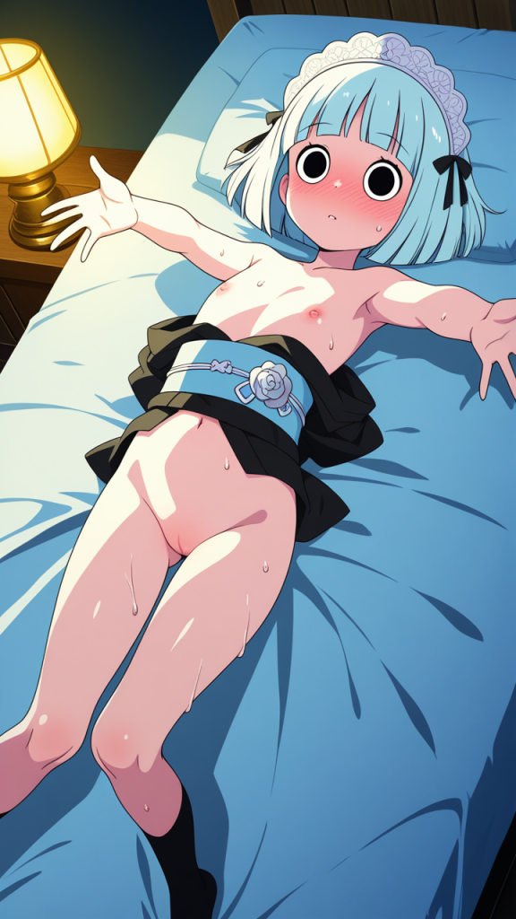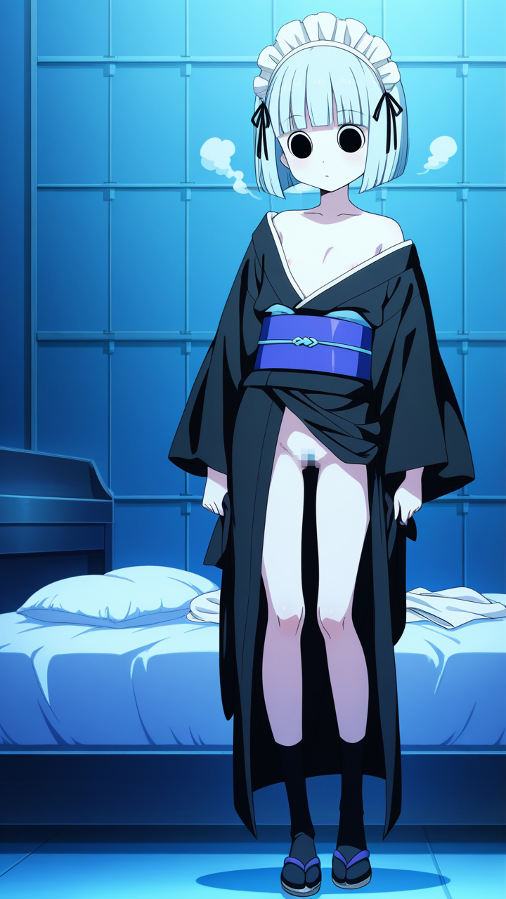 美少女,おっぱい,おしり,M字開脚,食い込み,乳首,パンツ,くぱぁ,,マゼンタ色の外ハネボブ,水色の大きなぱっちり目,貧乳・長身,深紫と黒の帯付き着物、銀色の花モチーフヘッドドレス、黒い足袋,ミステリアス