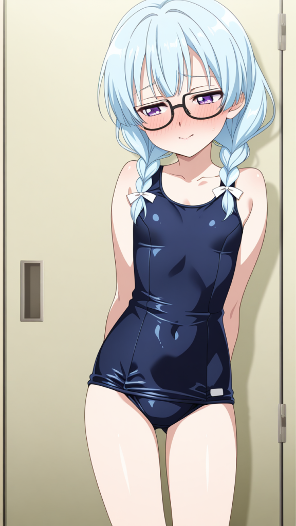 美少女,貧乳,おっぱい,乳首,微乳,ぺたんこ,スレンダー,,水色髪の三つ編み,紫の瞳、垂れ目気味のハーフ目,貧乳・小柄,スクール水着、黒縁眼鏡、白いリボン,クール・無口・憂い顔