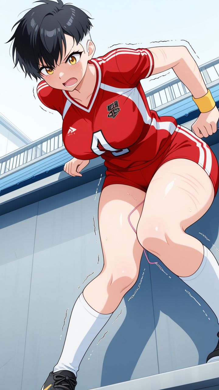 white short undercut hair, fluffy top, sharp sides,golden eyes, droopy half-lidded gaze,voluptuous, curvy, well-endowed,black and gold sports jersey, white high socks, black sneakers, white ribbon on chest, gold wristband on arm,competitive, determined, defiant expression, headstrong and spirited