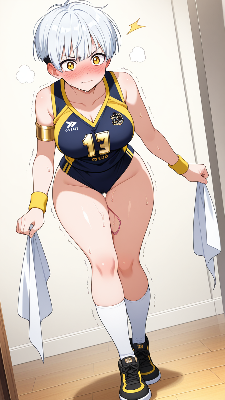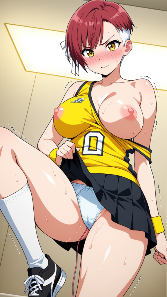 美少女,おっぱい,おしり,M字開脚,食い込み,乳首,パンツ,くぱぁ,バイブ,オナニー,,白髪の刈り上げショート、サイドは短く刈り込まれ、トップはやや長めでふんわり,金色の瞳、垂れ目気味のハーフ目,巨乳でむっちりとした体型,黒と金のスポーツジャージ、白いハイソックス、黒いスニーカー、胸元に白いリボン、腕に金色のリストバンド,勝ち気で負けず嫌い、常に前向きで挑戦的な表情