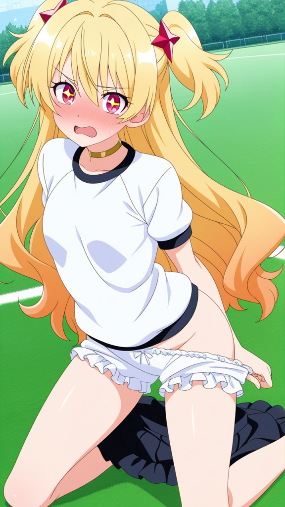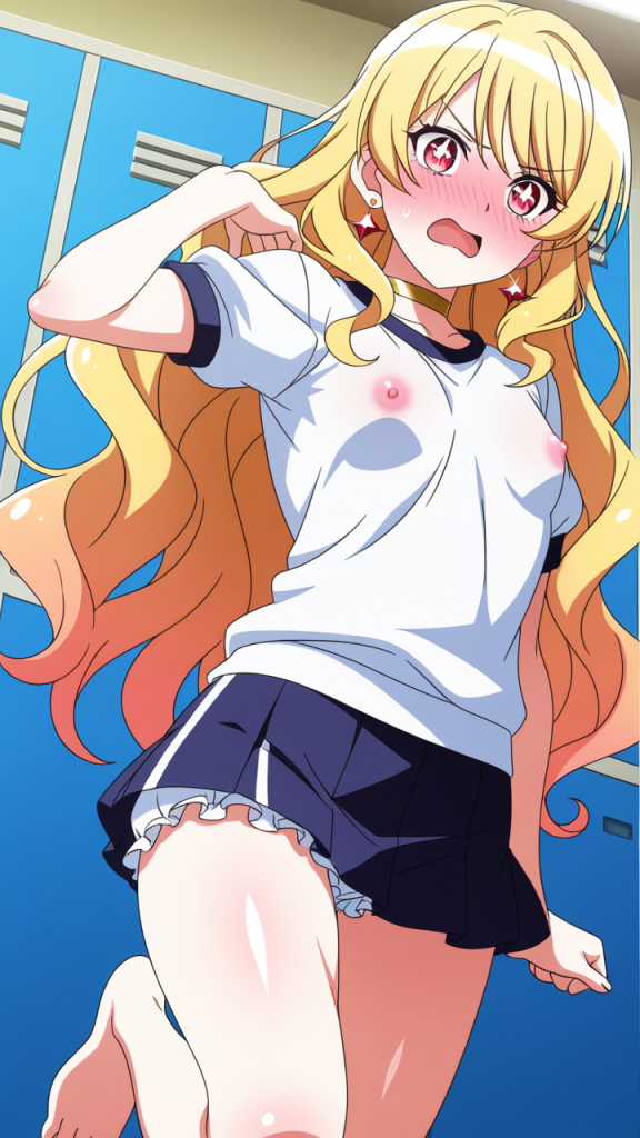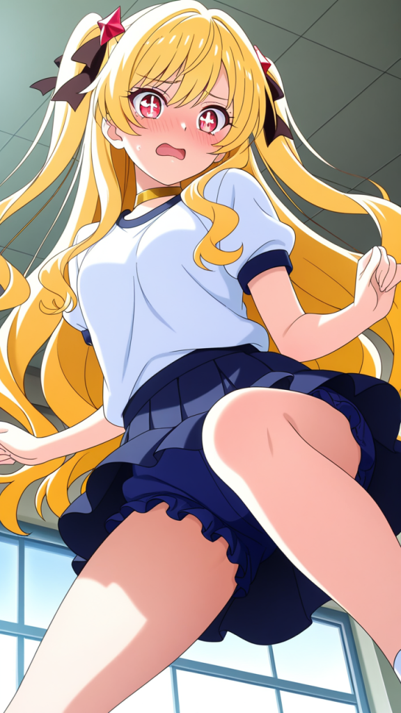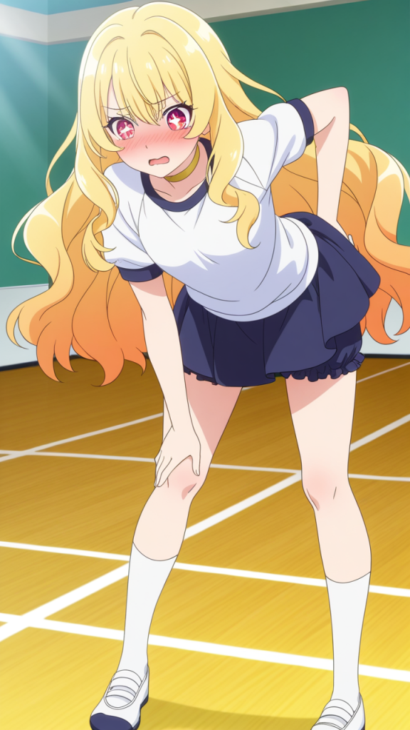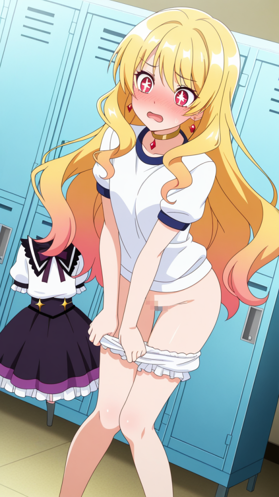 美少女,おっぱい,おしり,体操服,ブルマ,体育,,グラデーション(金色からピンク)のウェーブロング,赤い瞳で丸くてキラキラした目,細身・長身のモデル体型,黒と金色の魔法少女衣装、黒いフリル付きショートスカート、金色のチョーカー,気の強いボーイッシュで自信に満ちた態度