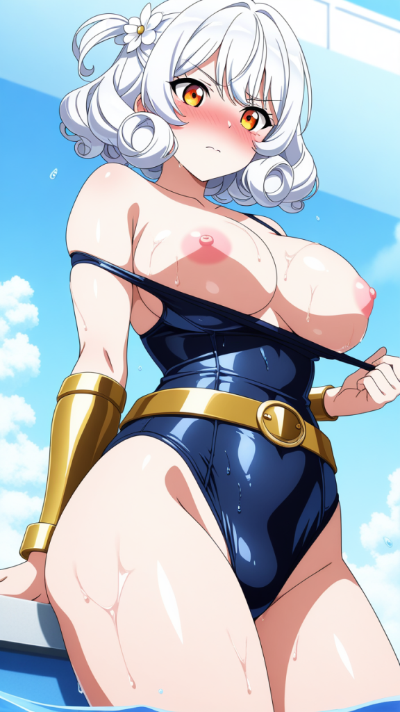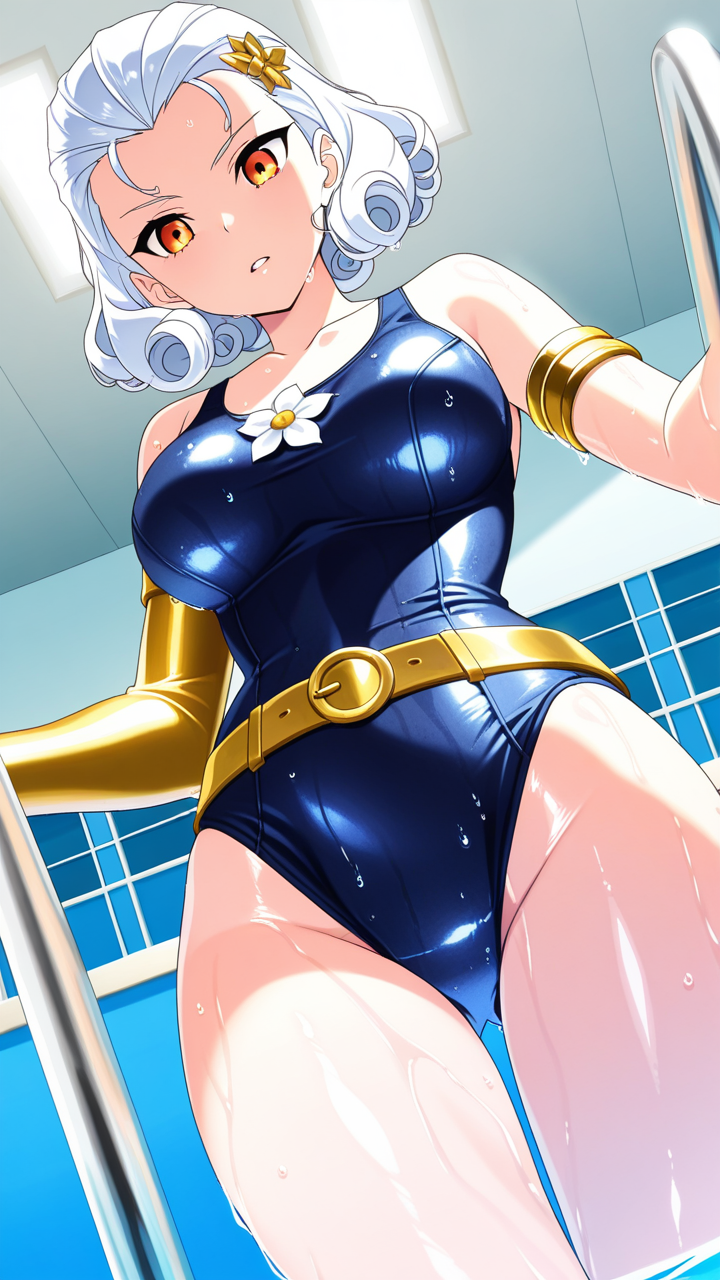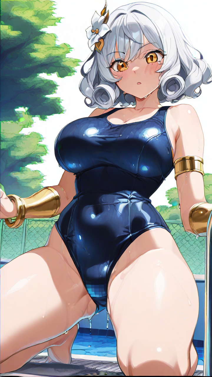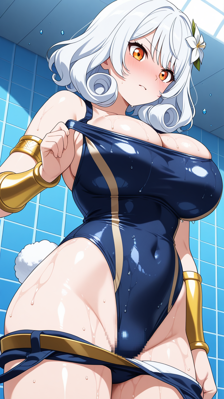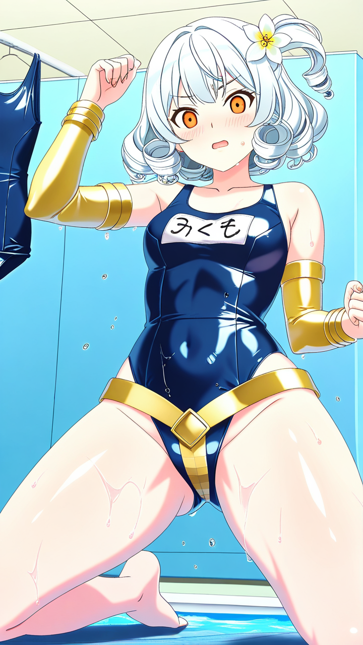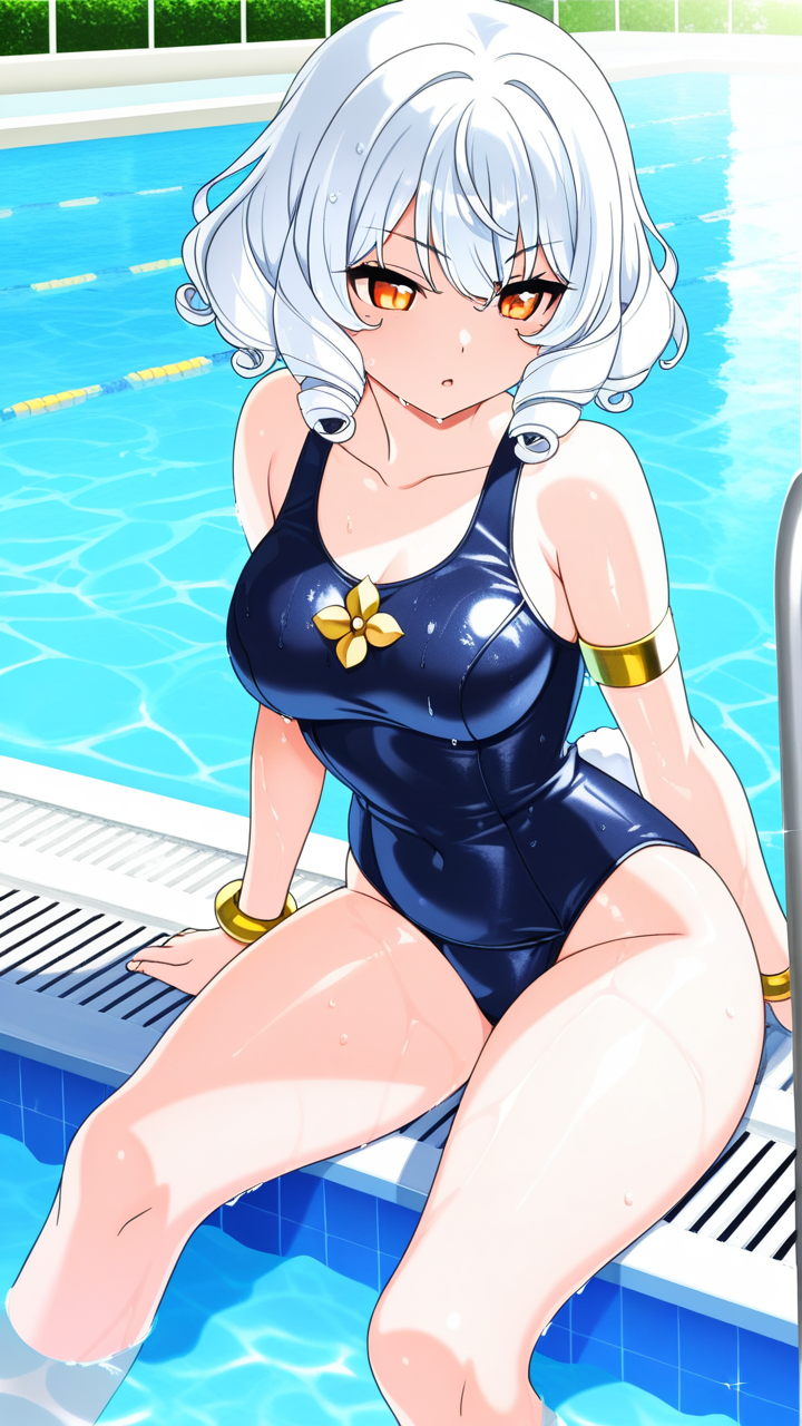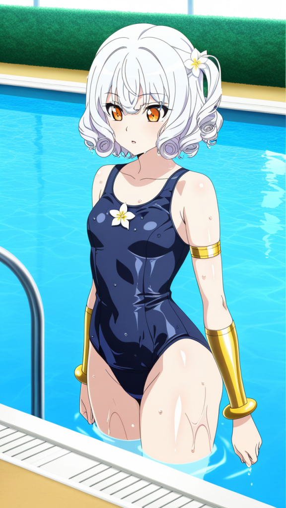 美少女,おっぱい,おしり,スク水,スクール水着,水着,,白髪のサイドテール、毛先はふんわりカール,琥珀色の瞳、ハーフっぽい二重,グラマラス,黒と金色のハイレグレオタード、腰に金色のベルト、胸元に白い花飾り、腕に金色のアームリング,勝ち気で負けず嫌い、自信家で闘志溢れる表情