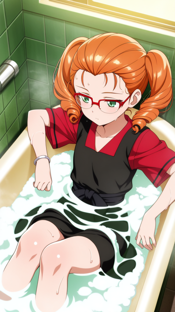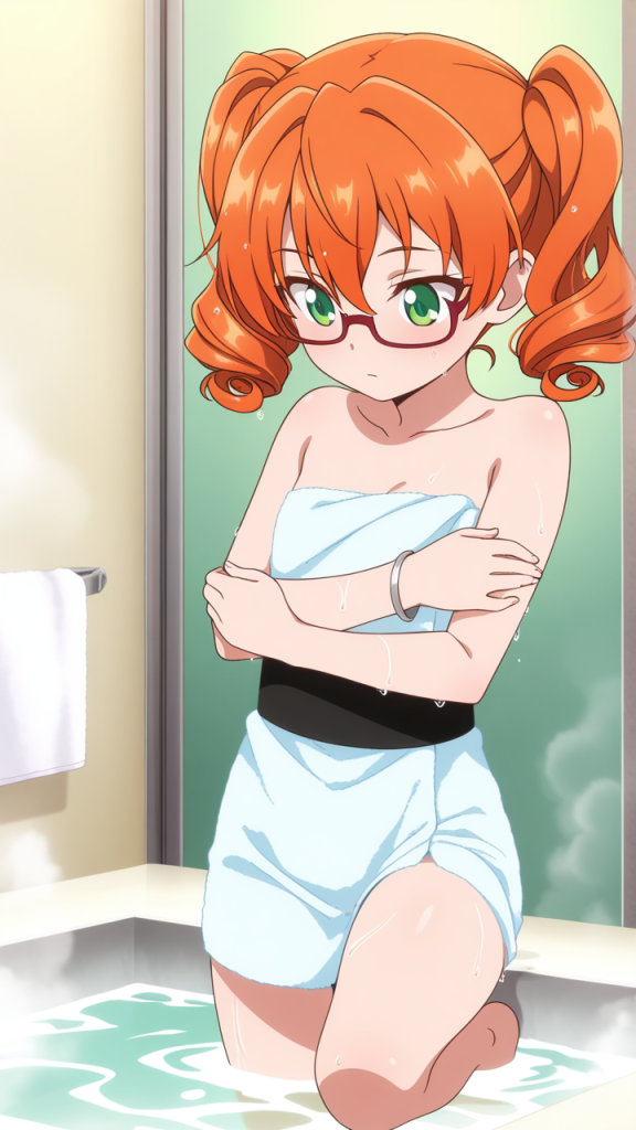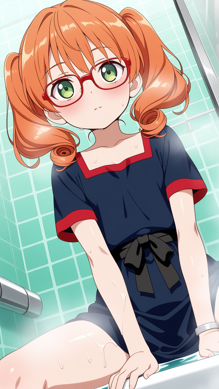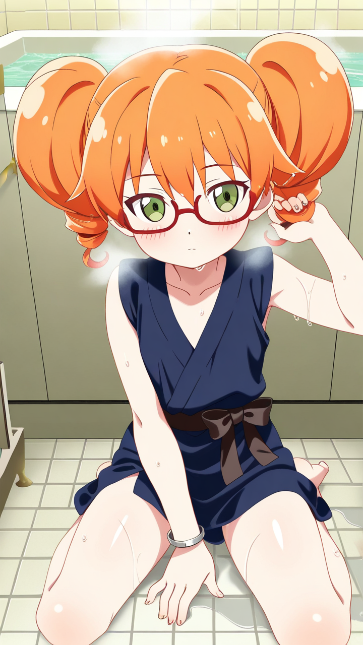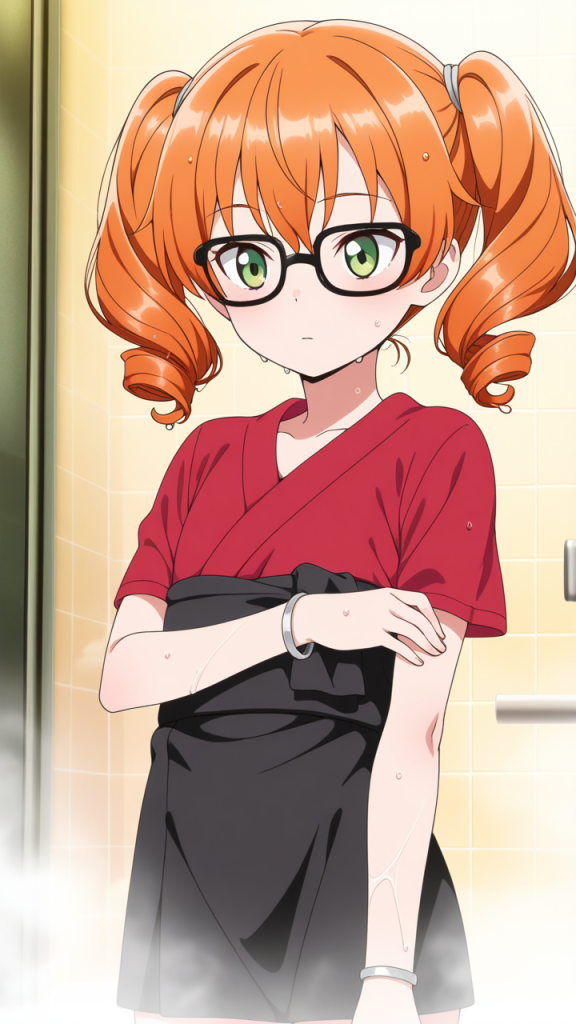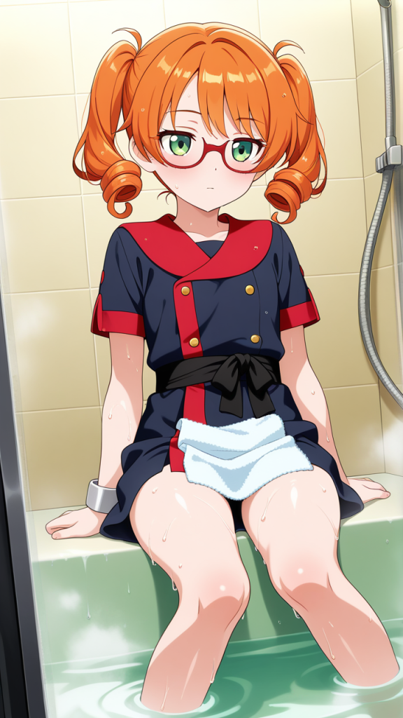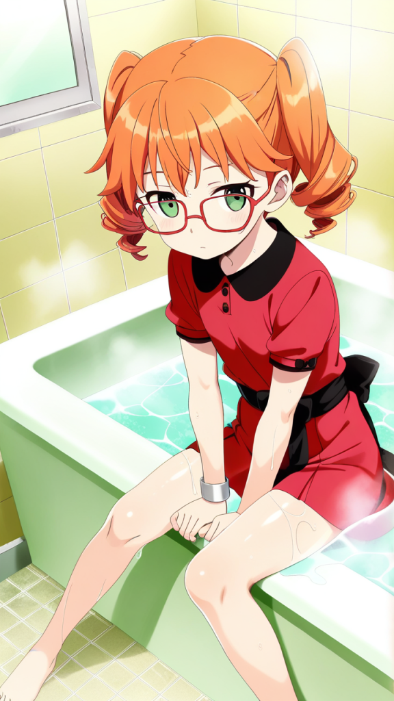 美少女,おっぱい,おしり,乳首,風呂,入浴,温泉,シャワー,,オレンジ髪のツインおさげ、毛先はふんわりカール,翠色の切れ長の瞳,ロリ体型,黒と赤の和洋折衷衣装、黒い帯、赤い半袖のシャツ、細フレーム眼鏡、腕に銀色のリストバンド,クール、無口、表情は冷淡