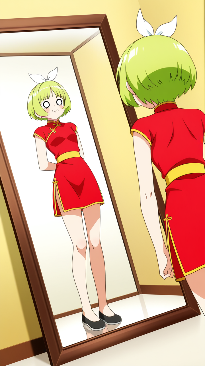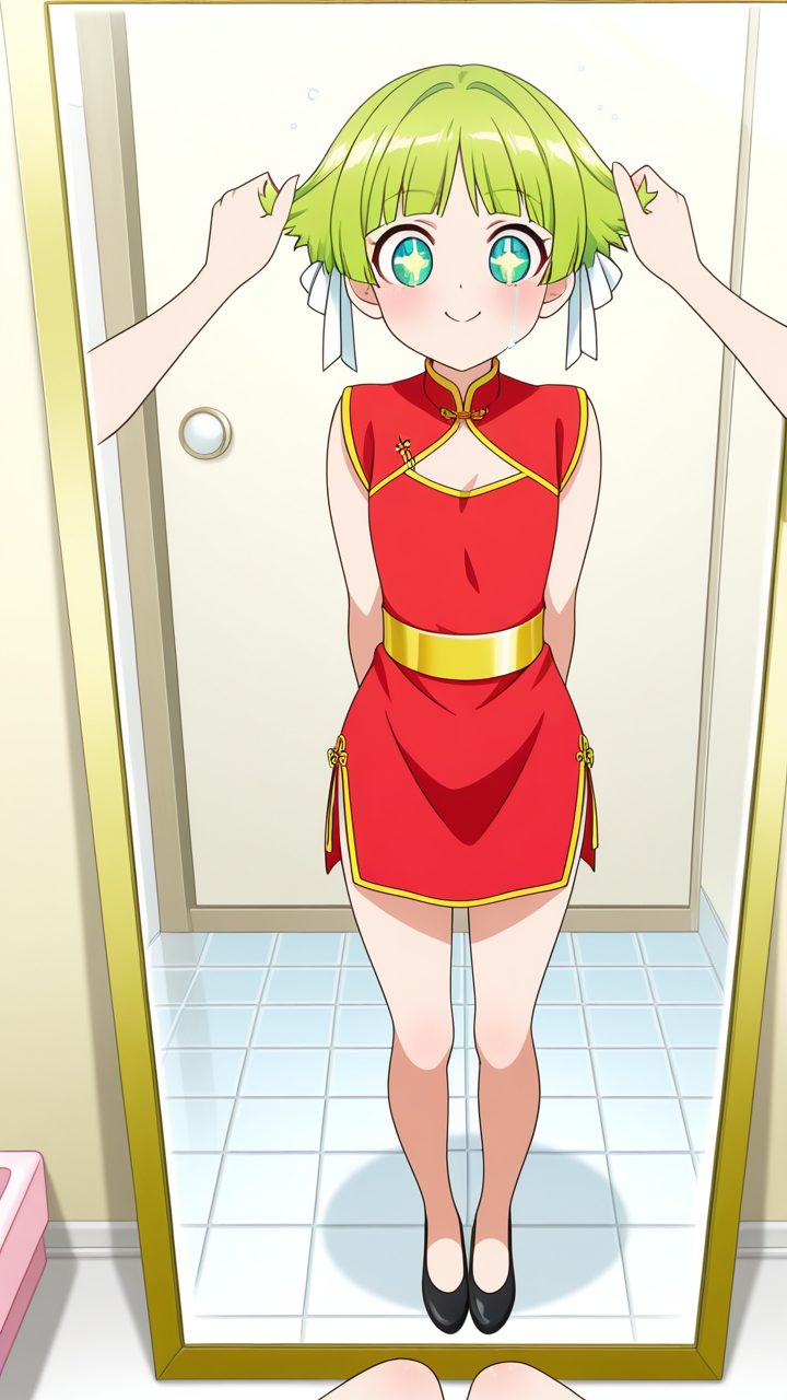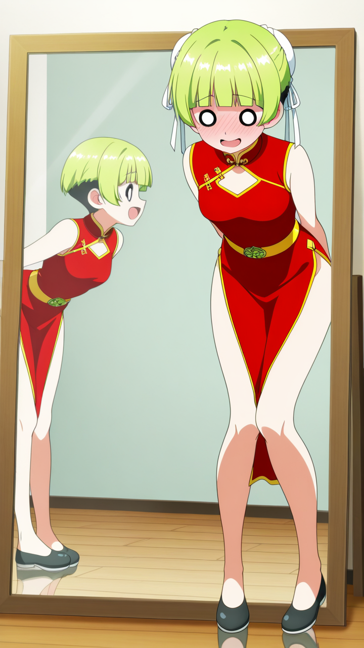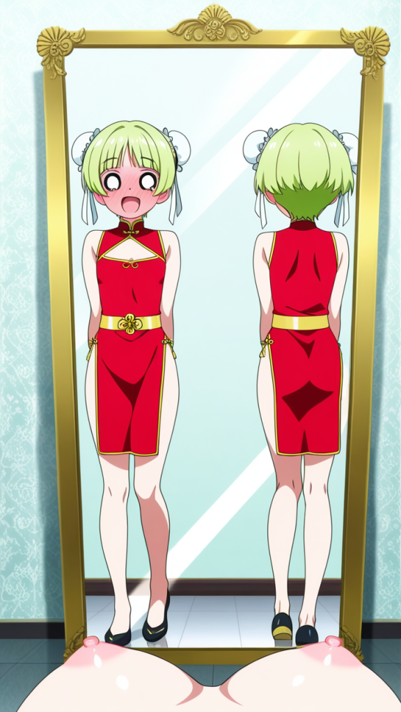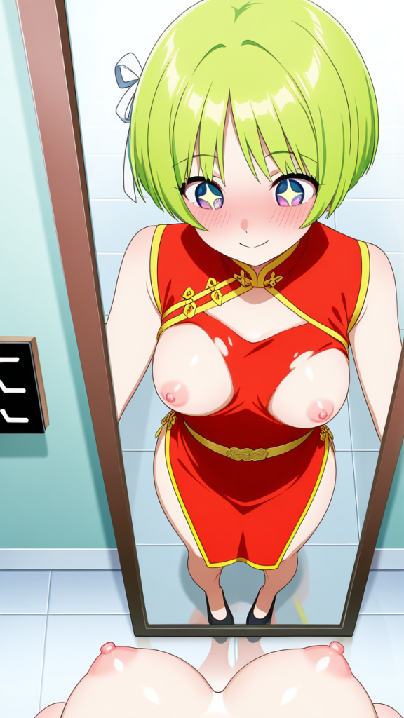 美少女,おっぱい,おしり,乳首,鏡,反射,鏡越し,,ライム色の刈り上げショート、前髪はシースルーバング,水色の丸くてキラキラした瞳,細身・長身モデル体型,緋色のチャイナドレス、胸元に白いリボン、腰に金色のベルト、黒いチャイナ靴,甘えんぼで、ころころと笑う陽気な性格