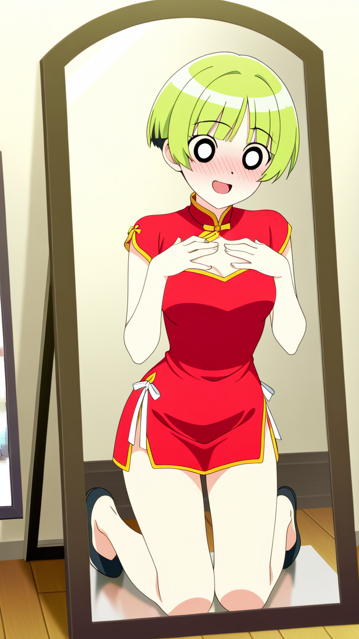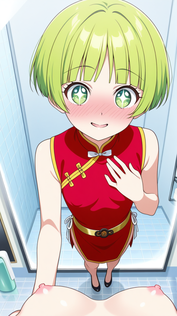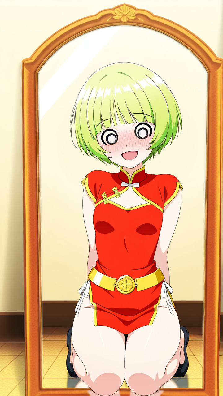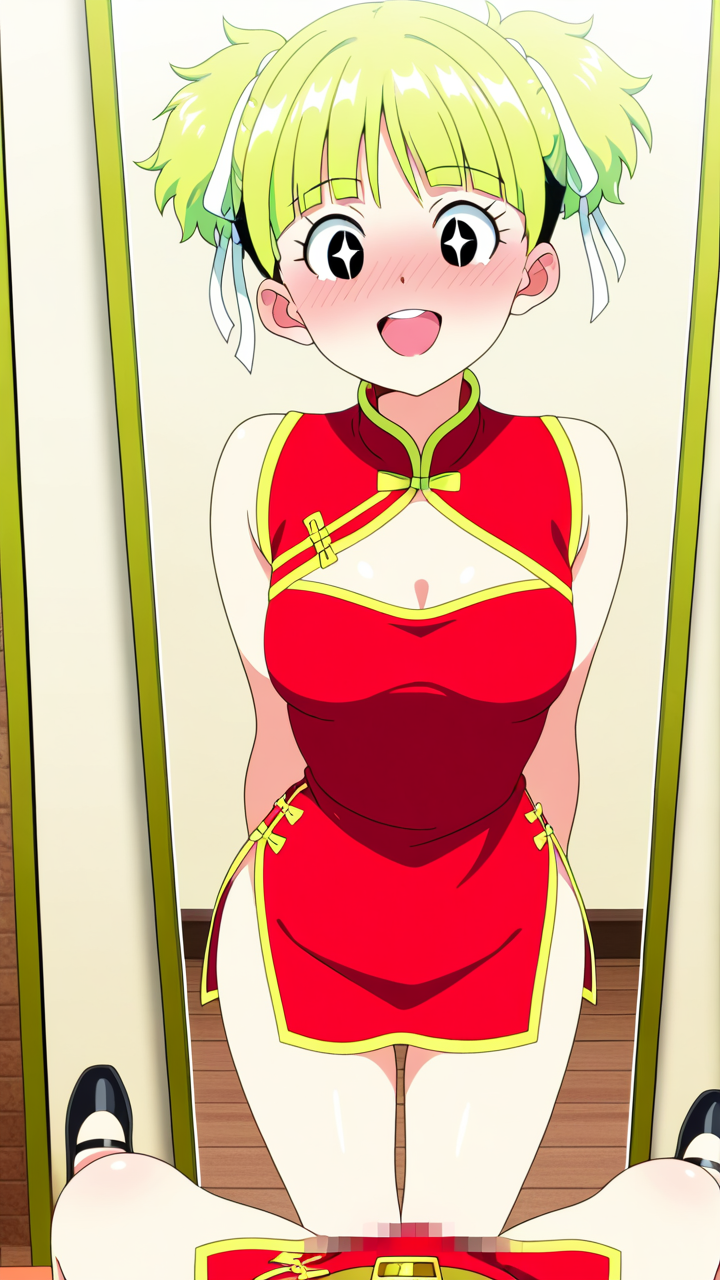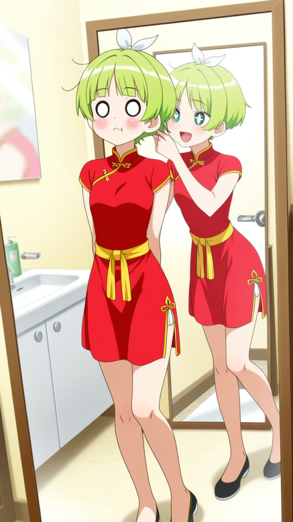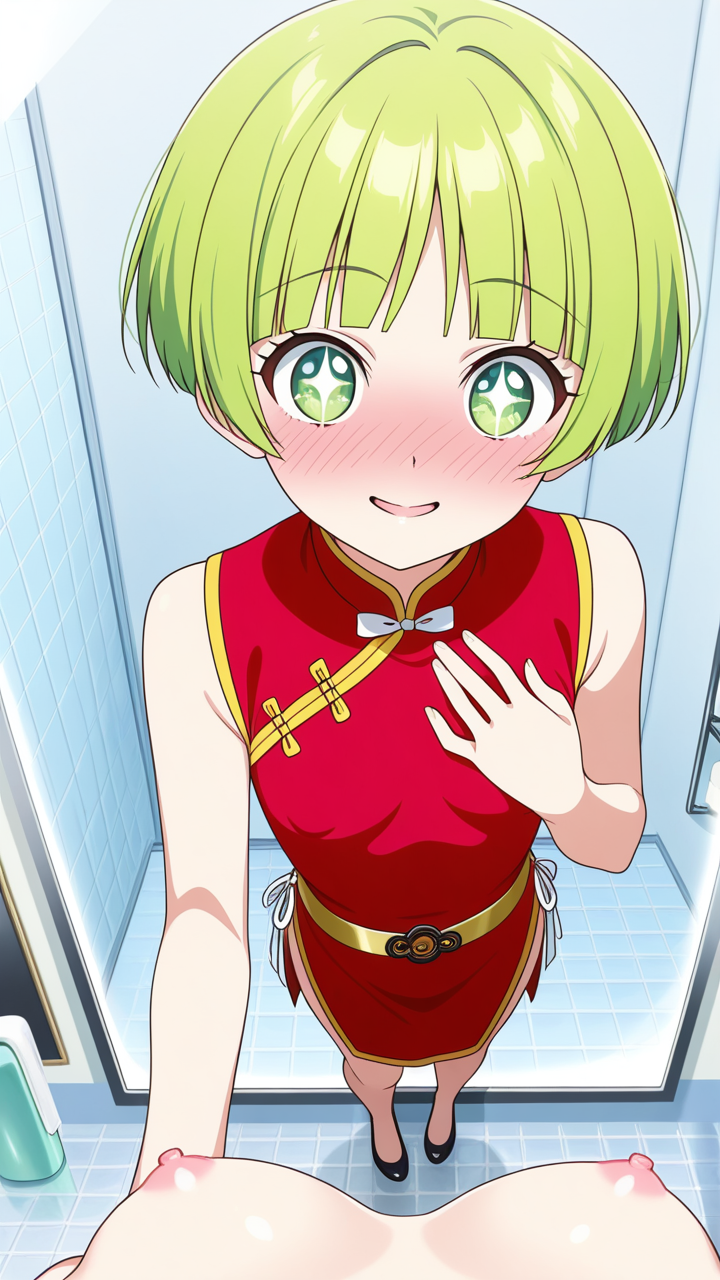 美少女,おっぱい,おしり,乳首,鏡,反射,鏡越し,,ライム色の刈り上げショート、前髪はシースルーバング,水色の丸くてキラキラした瞳,細身・長身モデル体型,緋色のチャイナドレス、胸元に白いリボン、腰に金色のベルト、黒いチャイナ靴,甘えんぼで、ころころと笑う陽気な性格