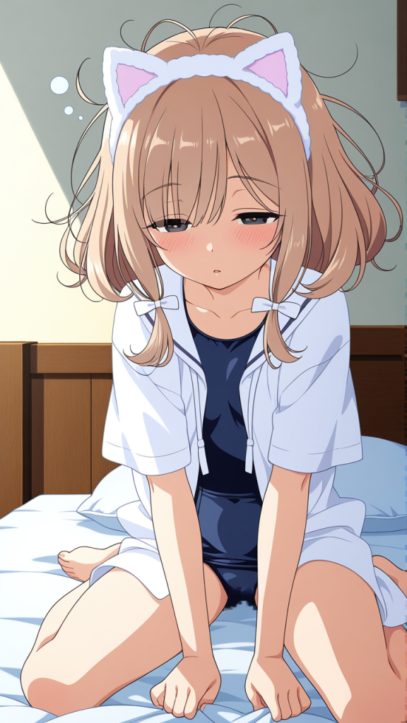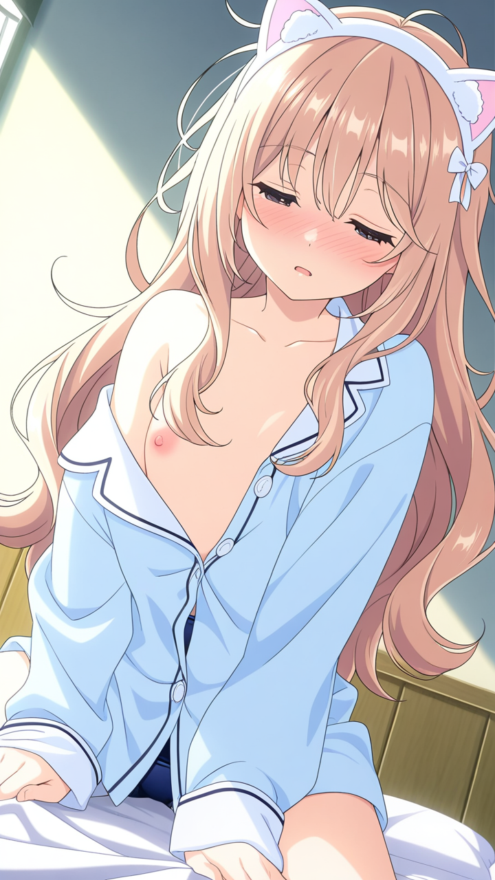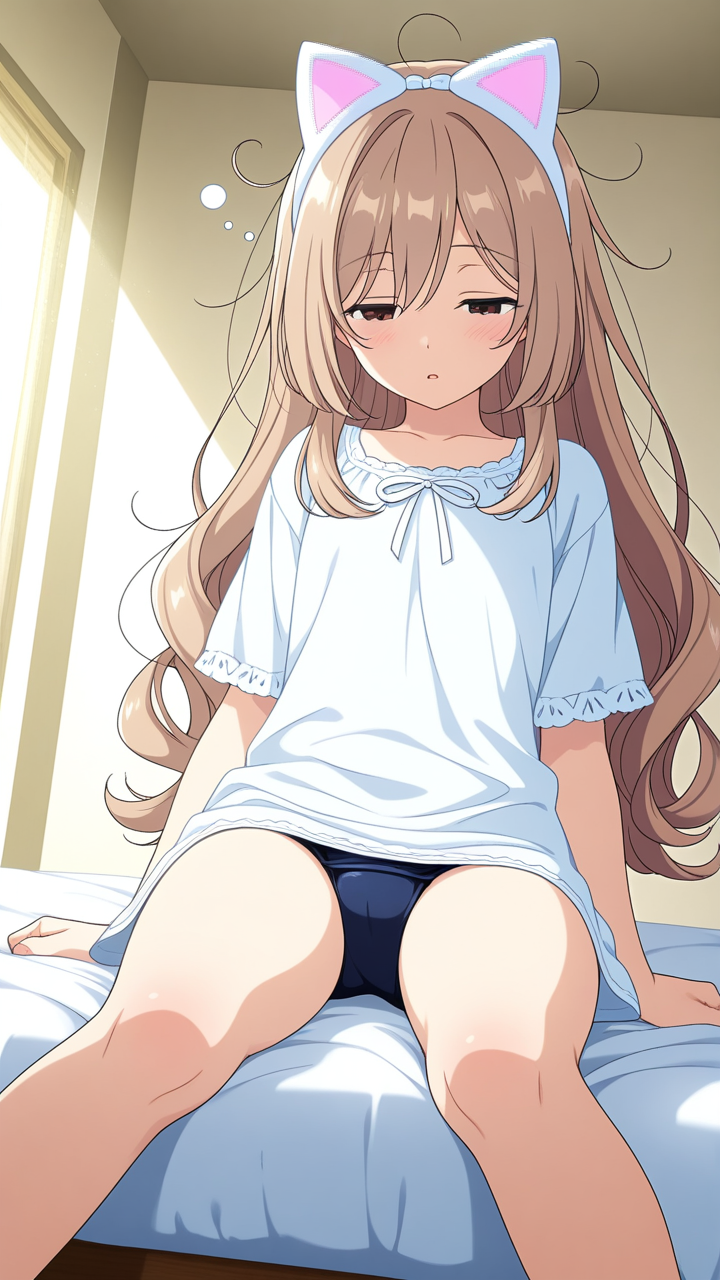 美少女,おっぱい,おしり,乳首,寝起き,パジャマ,朝,,茶髪のハーフアップ、毛先は軽くカール,黒い瞳、ハーフっぽい二重瞼,小柄でむっちりした体型,紺色のスクール水着、猫耳ヘッドアクセサリー、白いリボン,純粋無垢で素直、いたずら好きな一面も