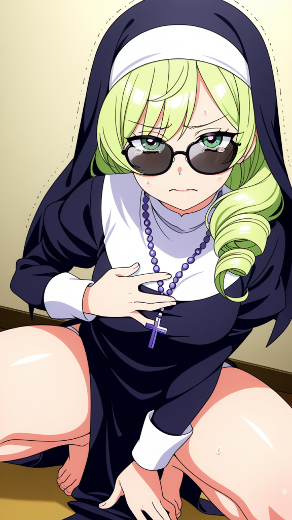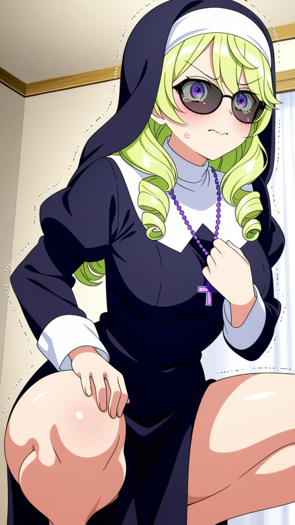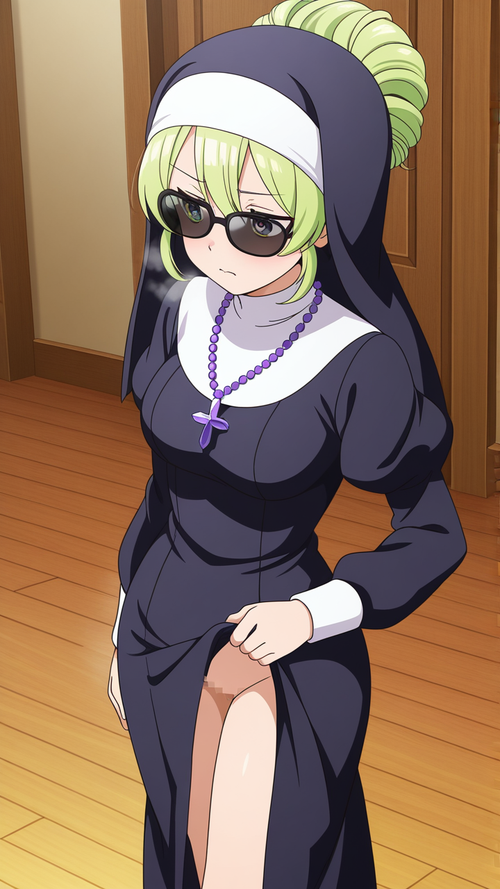 美少女,おっぱい,おしり,M字開脚,食い込み,乳首,パンツ,くぱぁ,,ライム色のハーフアップ、毛先はふんわりカール,深紅の瞳、細めのクールな目,背が高くスレンダー,白と紫の修道女服、紫のロザリオ、黒いサングラス,天然ドジっ子で不器用だが一生懸命