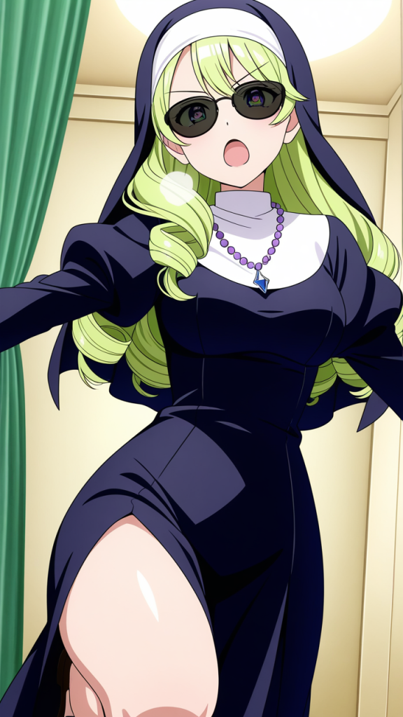 lime green half-up hairstyle with soft curled ends,deep crimson eyes, narrow and cool gaze,tall and slender build,white and purple nun habit, purple rosary beads, black sunglasses,airheaded and clumsy but earnest, natural klutz