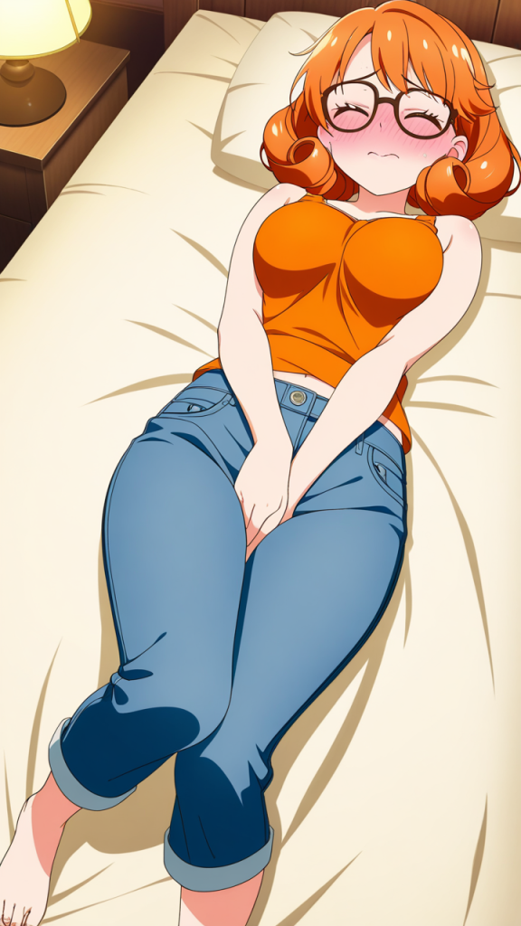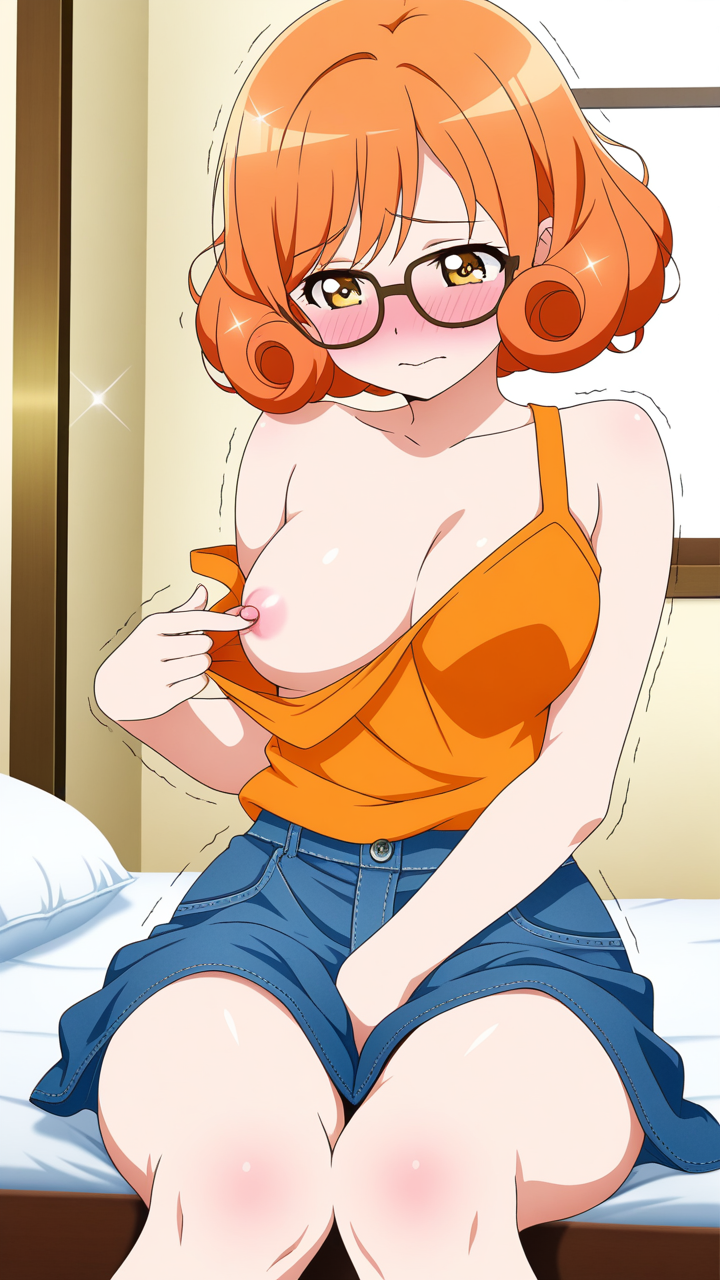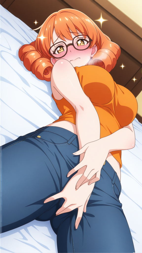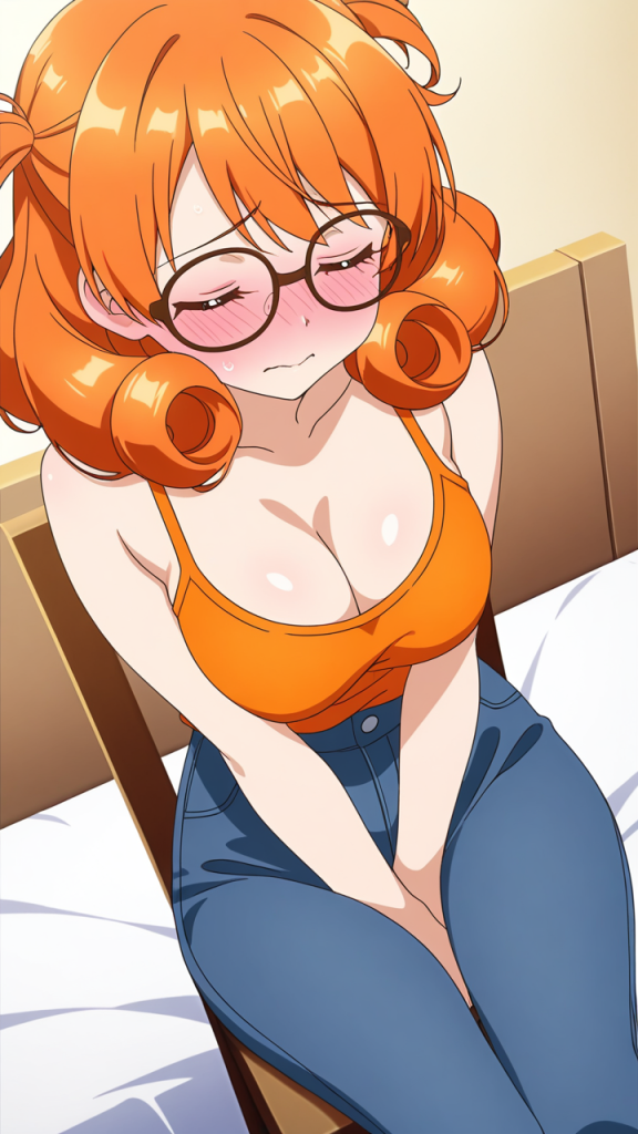 美少女,おっぱい,おしり,M字開脚,乳首,パンツ,くぱぁ,オナニー,自慰,指,マスターベーション,,オレンジ髪のアップスタイル、毛先はふんわりカール,金色の丸くてキラキラした瞳,巨乳でむっちりした体型,白と紺のカジュアルジーンズ、オレンジ色のタンクトップ、細フレーム眼鏡,恥ずかしがり屋で、照れやすい性格
