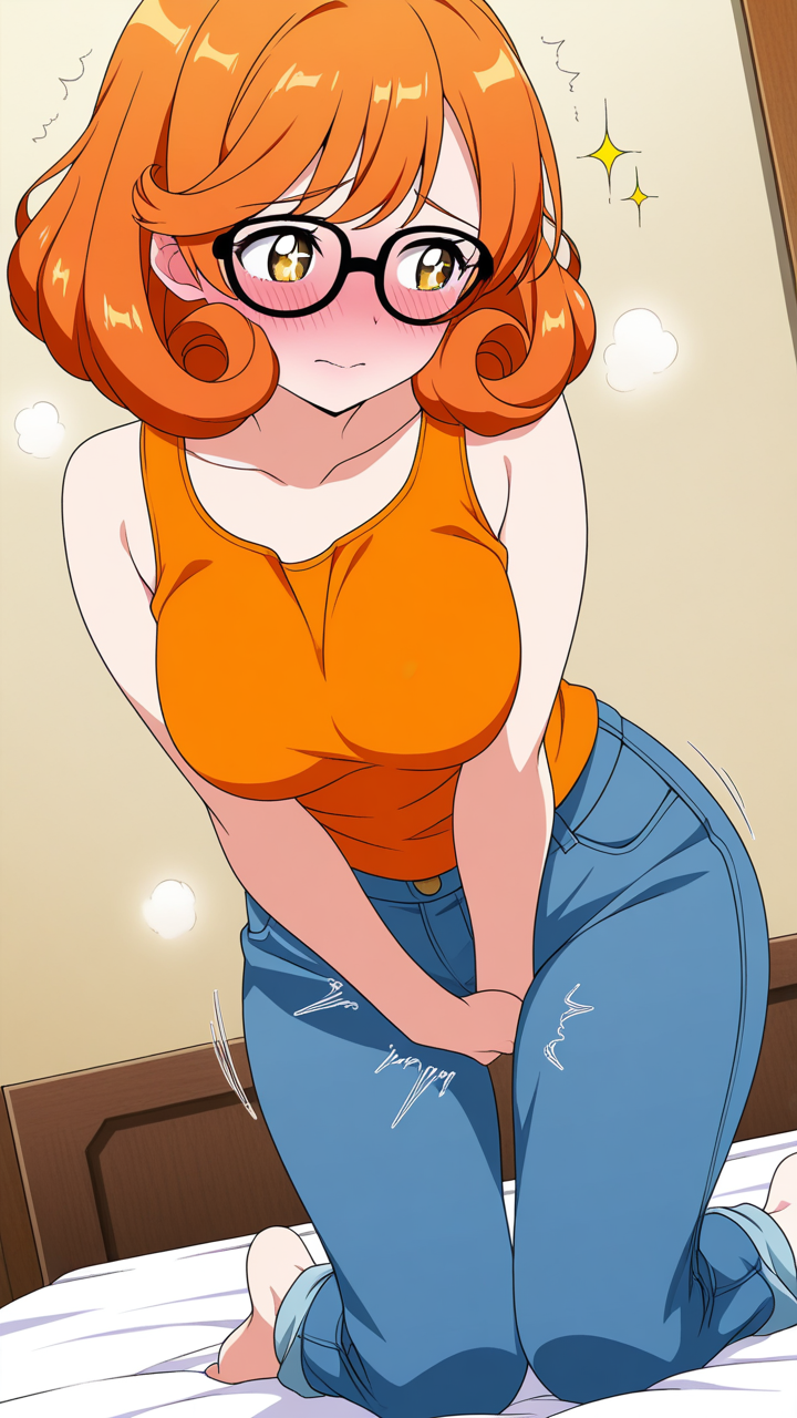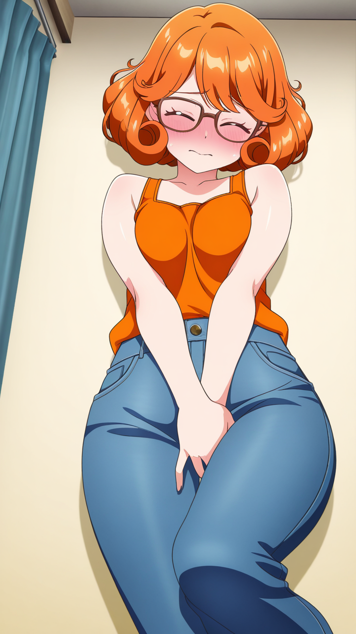 orange hair, upstyle with fluffy curled ends,golden eyes, round and sparkling,busty, soft and curvy figure,white and navy casual jeans, orange tank top, thin-framed glasses,shy and easily flustered, blushing often