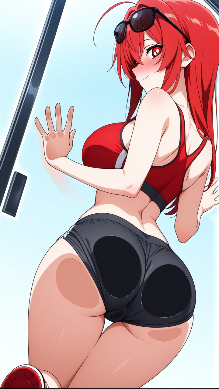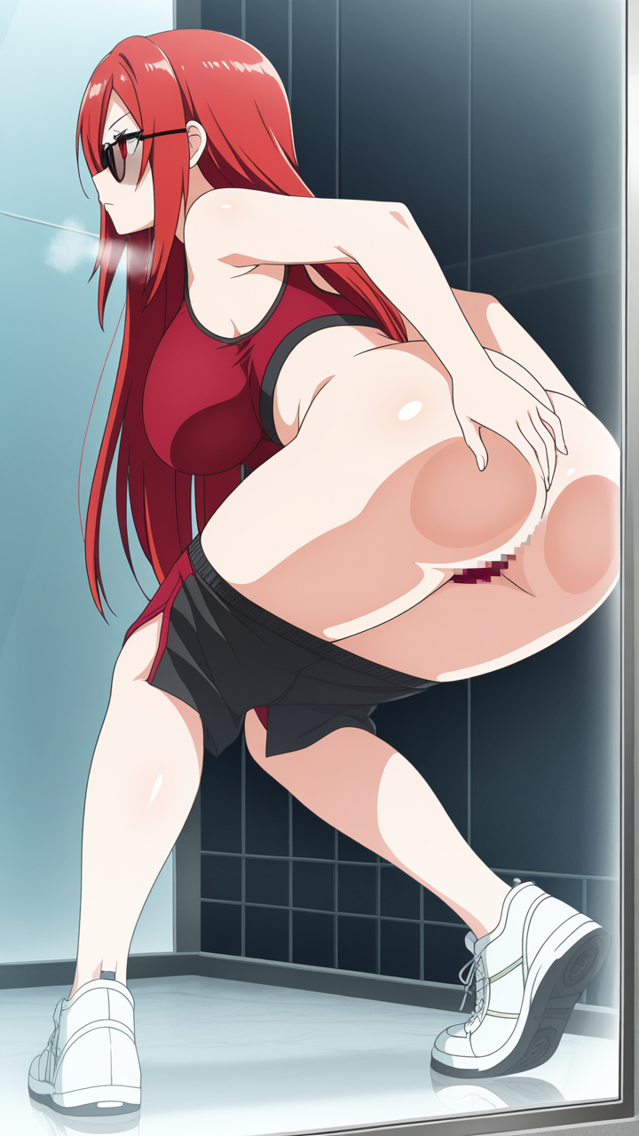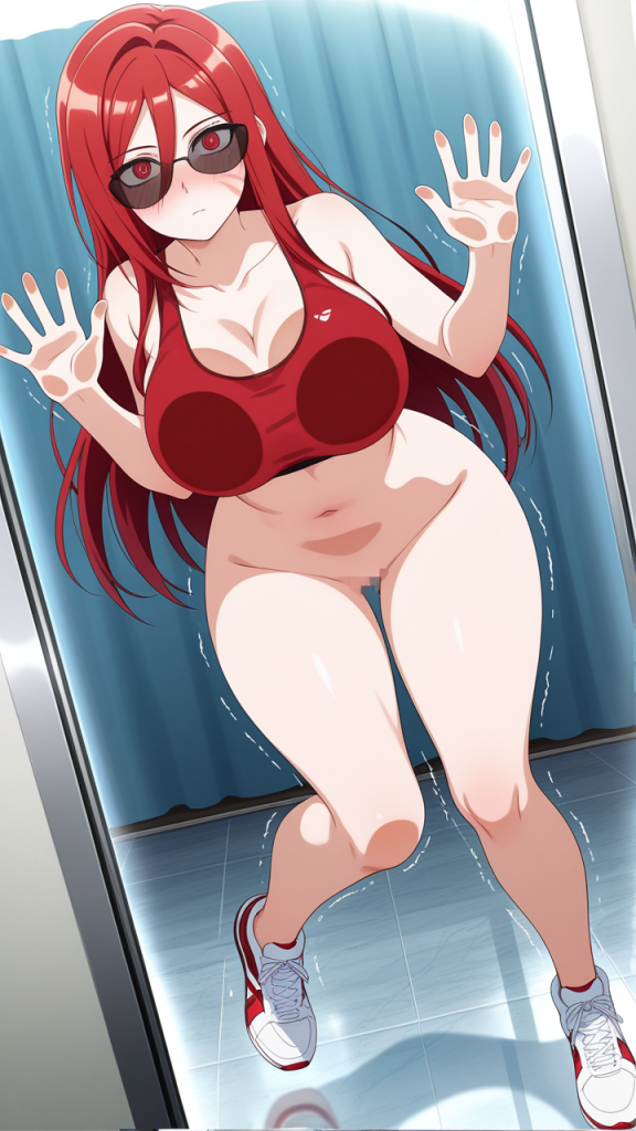 美少女,おしり,ガラス,押し付け,圧迫,ヒップ,くぱぁ,パンツ,,赤髪のロングストレート,深紅の瞳、切れ長の目,巨乳、むっちりとした体型,黒と赤のスポーツウェア上下、赤いスポーツブラ、黒いランニングパンツ、白いハイカットスニーカー、黒いサングラス,クール、無口、無表情