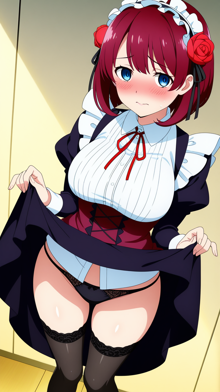 美少女,おっぱい,おしり,M字開脚,乳首,パンツ,くぱぁ,開脚,,赤髪のボブカット、毛先は内巻きにまとめた清潔感のあるスタイル,水色の瞳、細めでクールな目つき,グラマラスな体型,黒と深紅のドラゴンメイド服、胸元に大きな赤いリボン、黒いニーハイソックス、黒いエナメルローファー、髪に赤い花飾り,ヤンデレ気味、執着心が強く、好きな相手には過度に親密になろうとする傾向がある。クールな外見とは裏腹に内に秘めた激しさを持つ