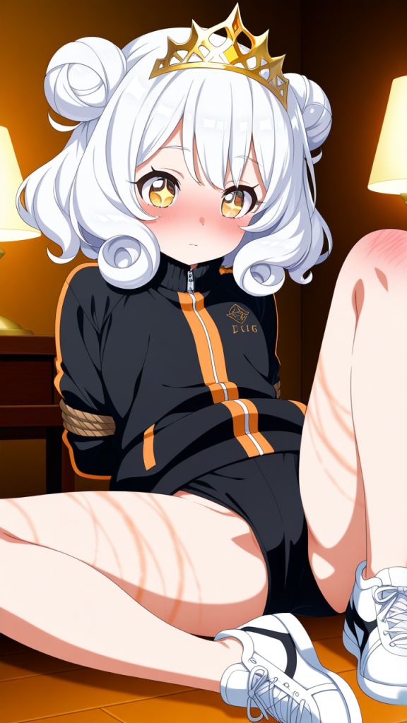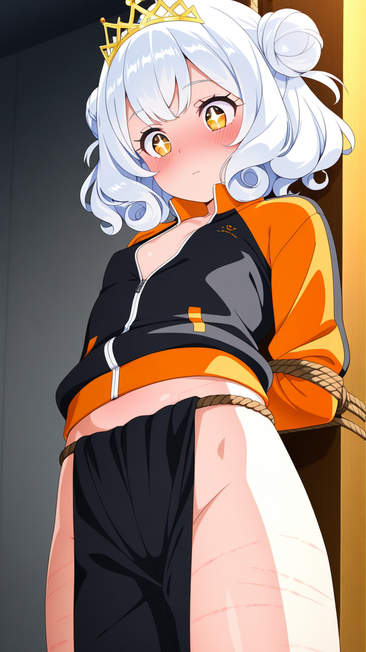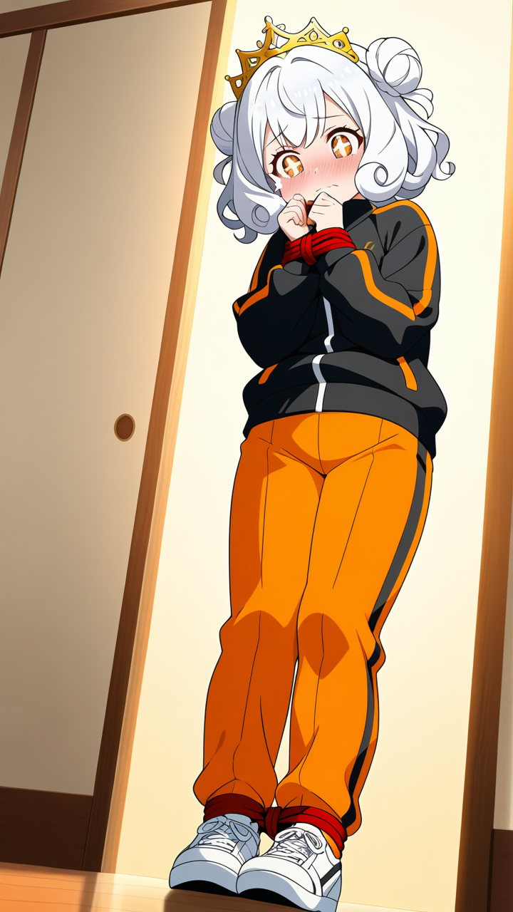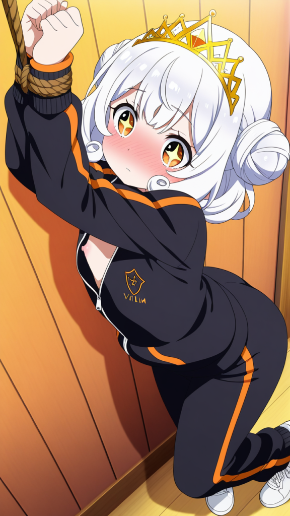 美少女,おっぱい,おしり,乳首,手縛り,拘束,ロープ,,白髪のお団子ヘア、毛先はふんわりカール,橙色の丸くてキラキラした瞳,小柄でむっちりした体型,オレンジと黒のジャージ上下、白いスニーカー、金色のティアラ型ヘッドドレス,ミステリアスで無表情だが、時折微笑む