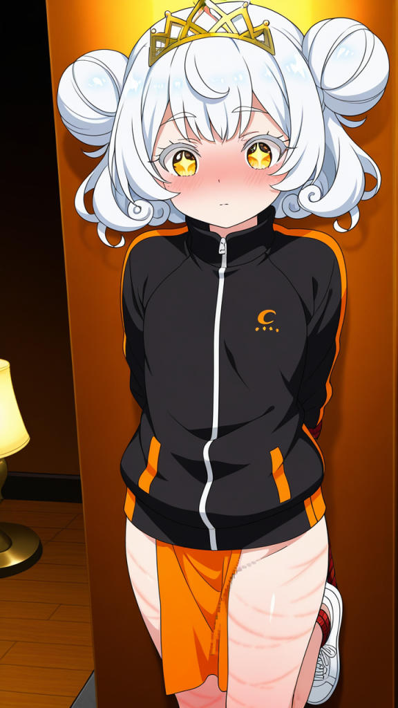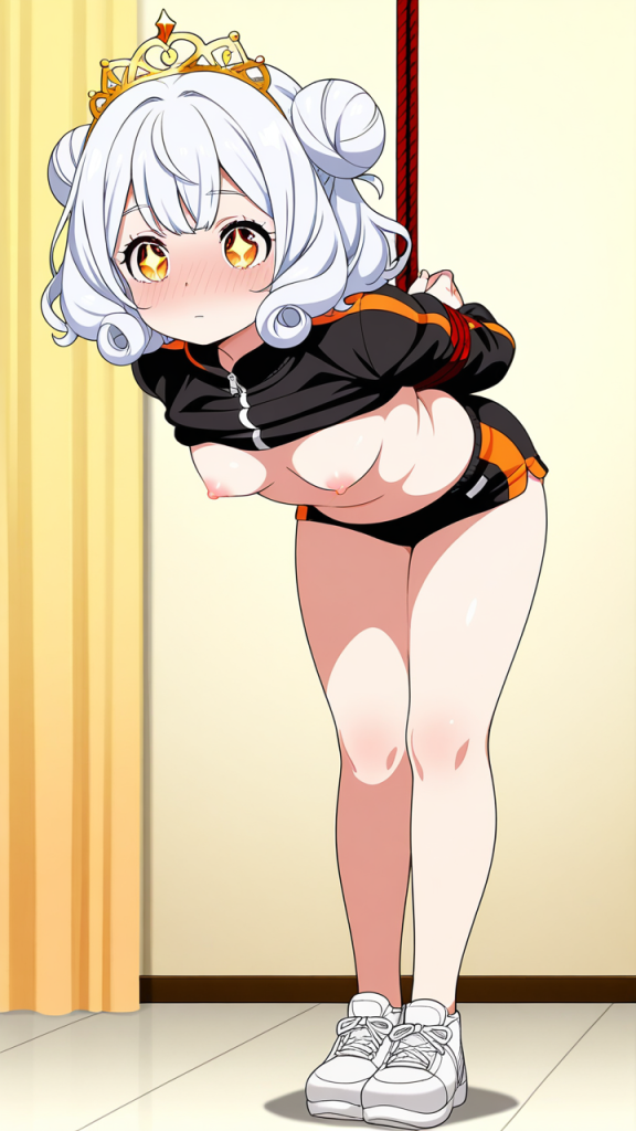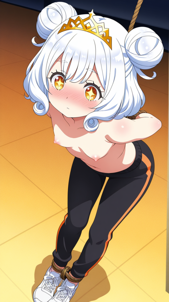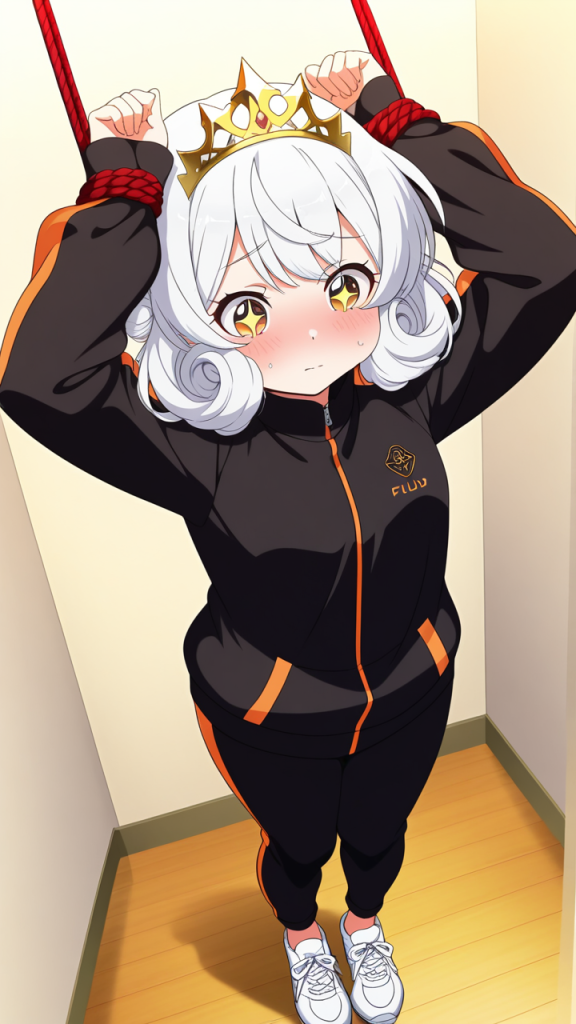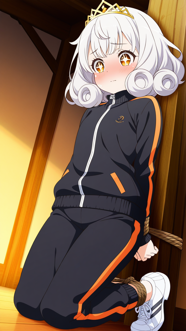 美少女,おっぱい,おしり,乳首,手縛り,拘束,ロープ,,白髪のお団子ヘア、毛先はふんわりカール,橙色の丸くてキラキラした瞳,小柄でむっちりした体型,オレンジと黒のジャージ上下、白いスニーカー、金色のティアラ型ヘッドドレス,ミステリアスで無表情だが、時折微笑む