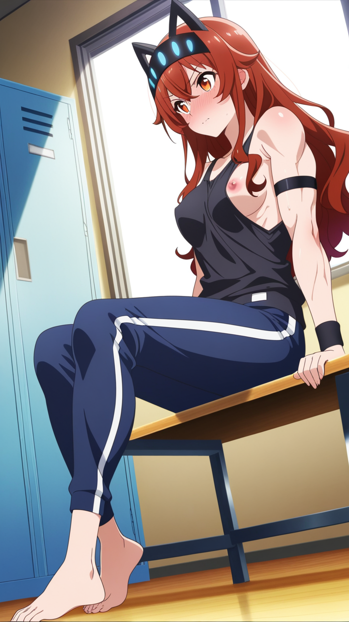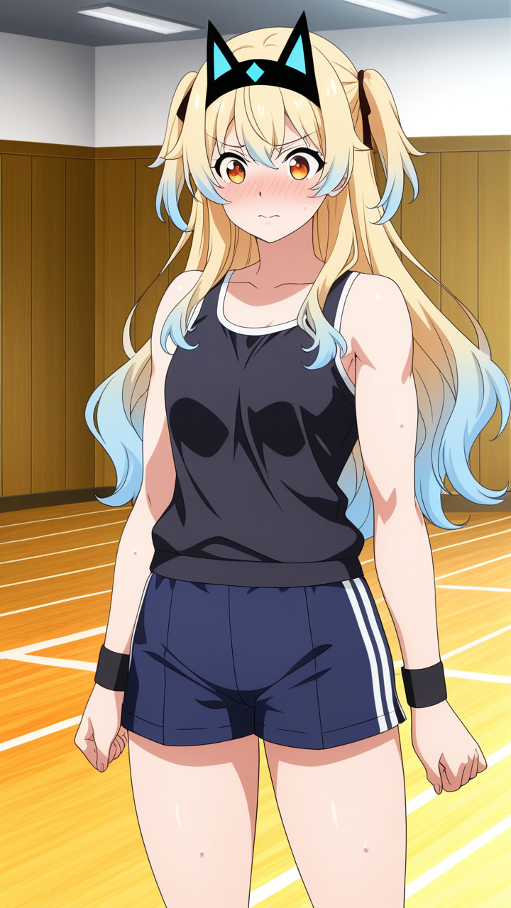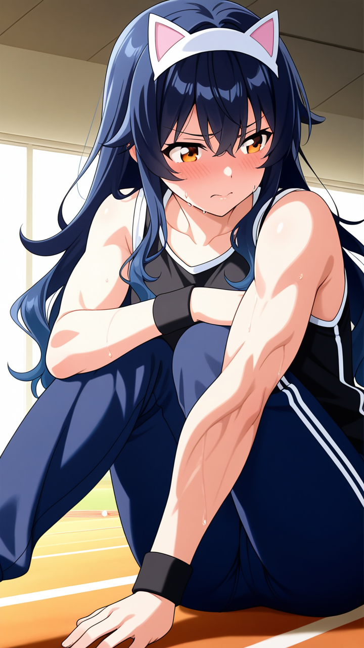 美少女,おっぱい,おしり,体操服,ブルマ,体育,,黒から青へのグラデーションウェーブロング,琥珀色の大きなぱっちり目,スポーティーで筋肉質な体型,濃紺のカジュアルジーンズ、黒いタンクトップ、猫耳ヘッドアクセサリー、腕に黒いリストバンド,気の強いボーイッシュで、勝気で行動的