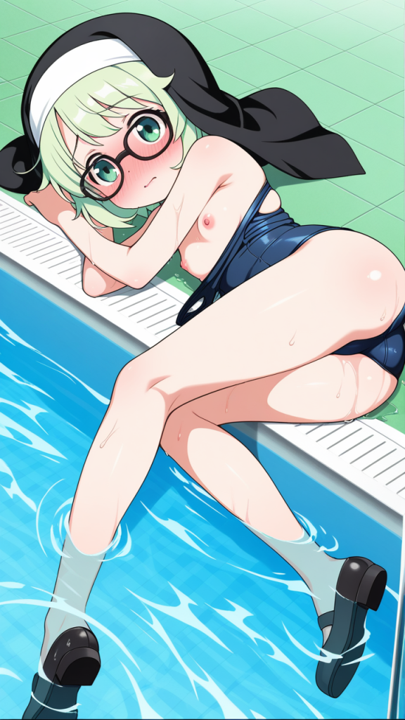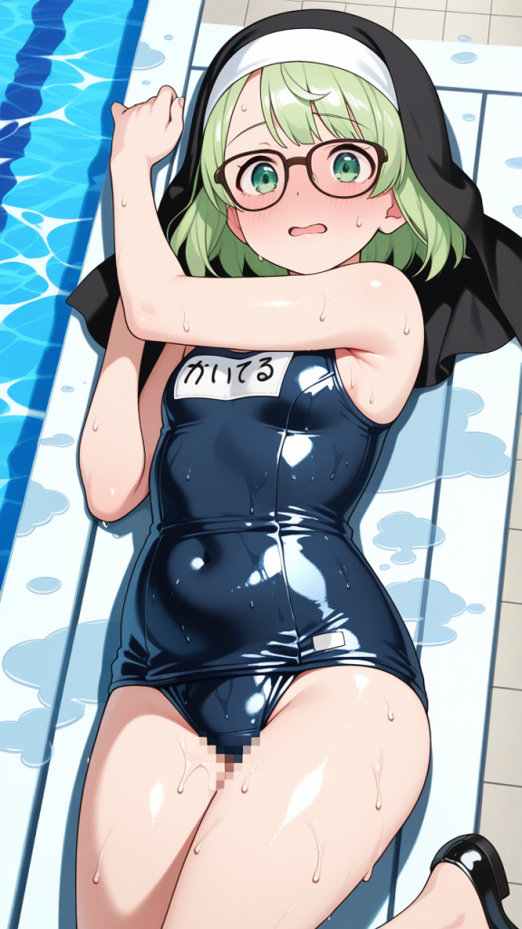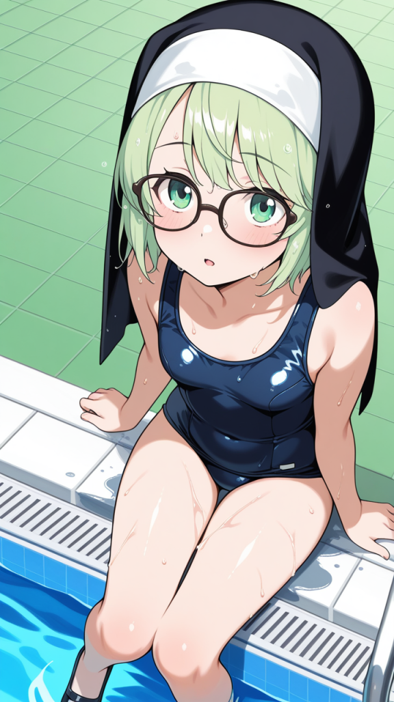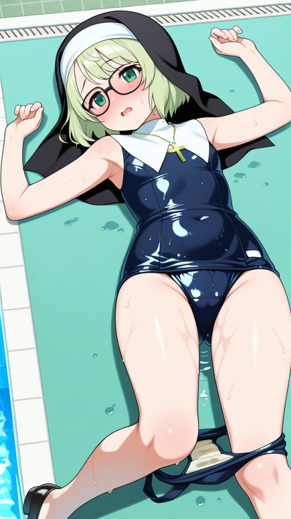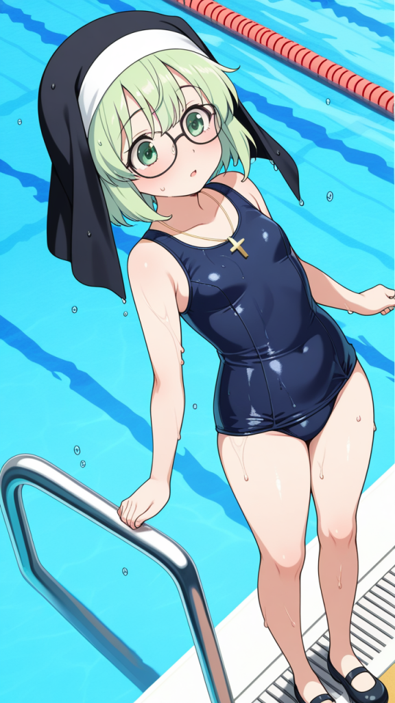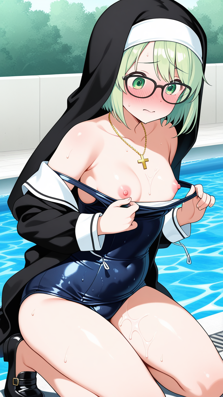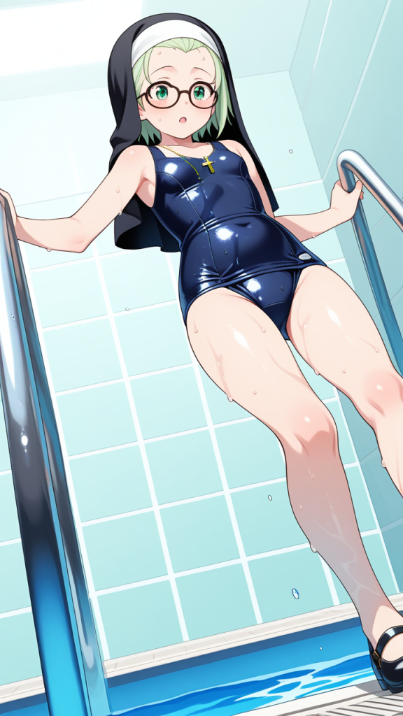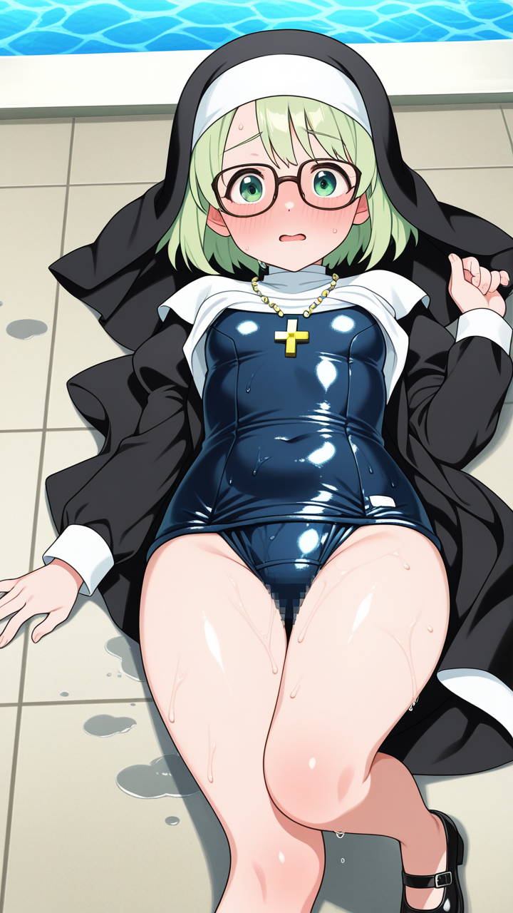 美少女,おっぱい,おしり,スク水,スクール水着,水着,,ライム色のショートカット、毛先は軽くレイヤー入りで動きのあるスタイル,緑の瞳、切れ長の目,小柄でむっちりとした柔らかい体型,白と深緑の修道女服、胸元に薄緑のロザリオ、細フレームの眼鏡、黒いマリアシューズ,天然ドジっ子、純真で無邪気、よく転んだり物を落とす