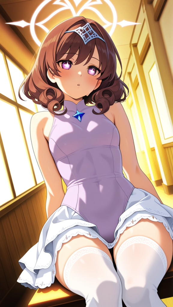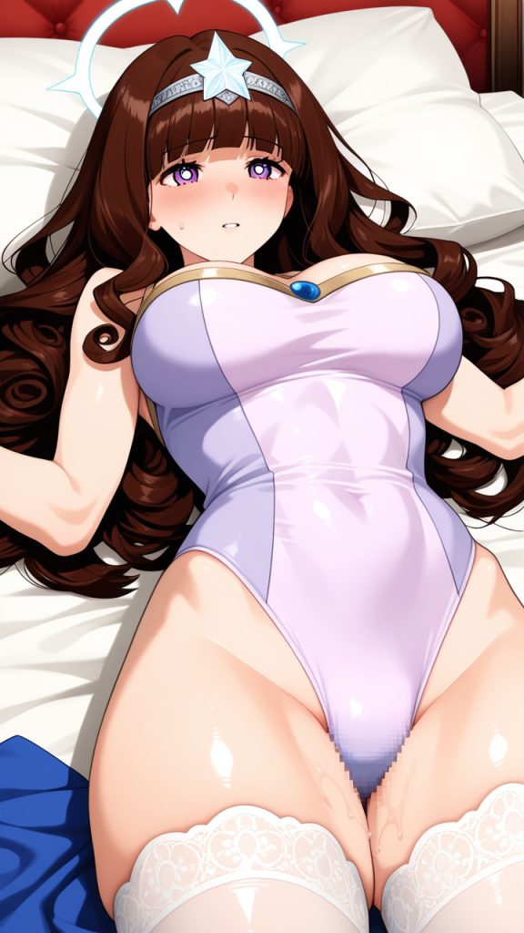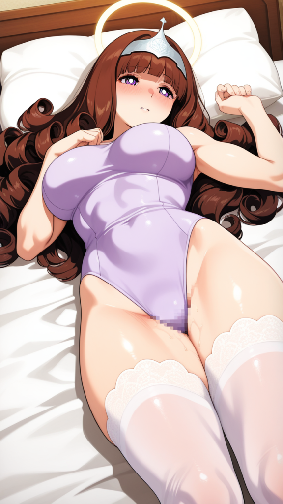 美少女,おっぱい,おしり,ニーソ,絶対領域,太もも,,茶髪の内巻きセミロング,深紅の瞳、丸くてキラキラした目,スポーティー・筋肉質,白と紫の体操服、天使の輪のヘッドアクセサリー,おっとり癒し系