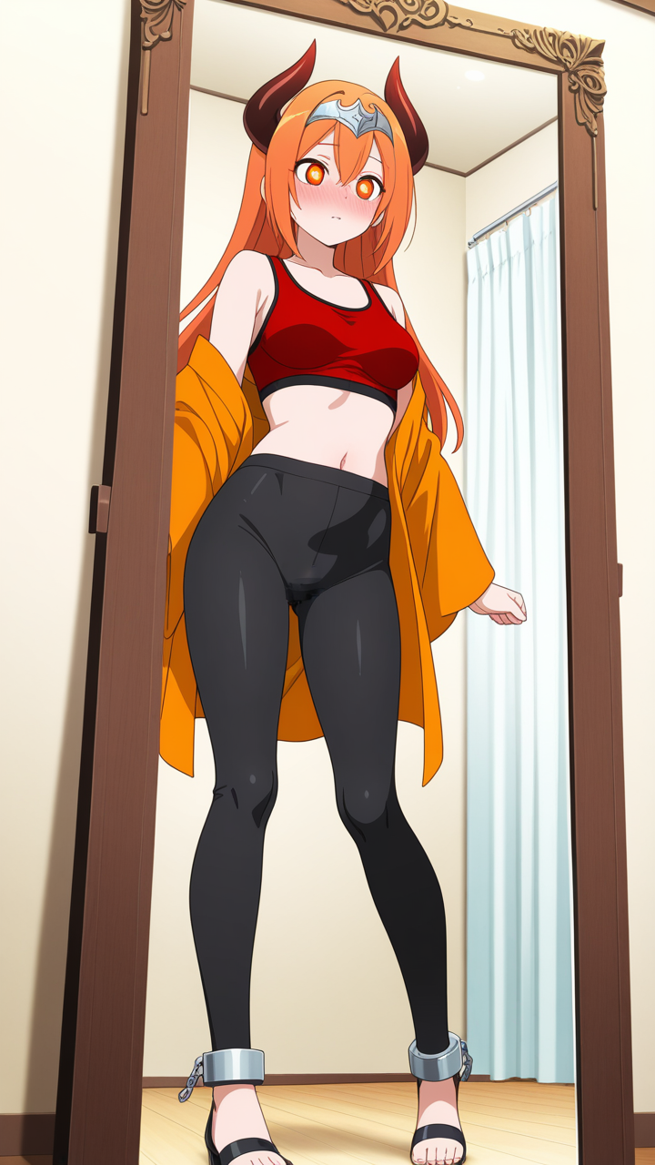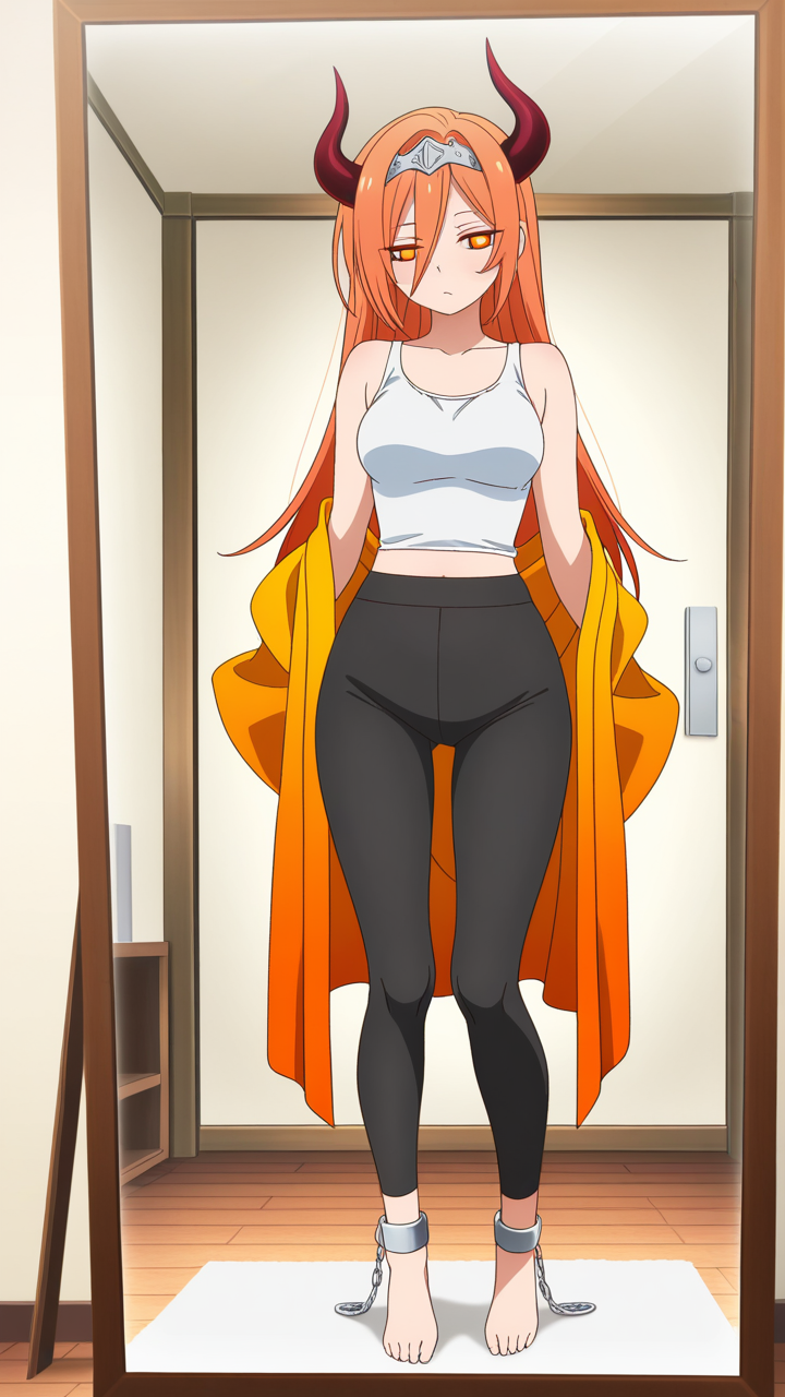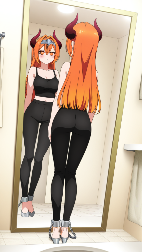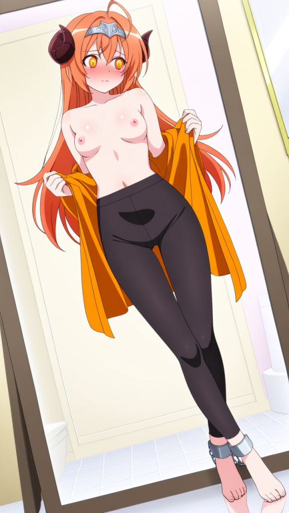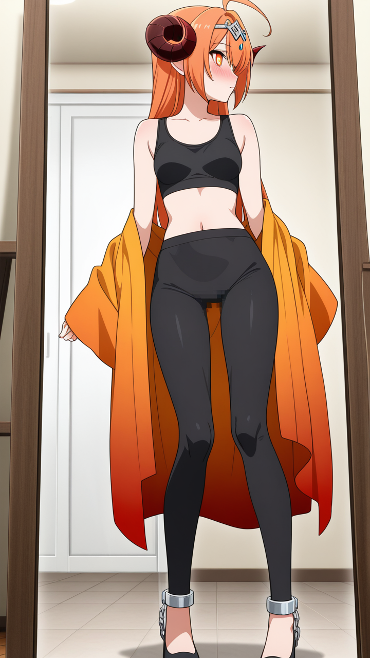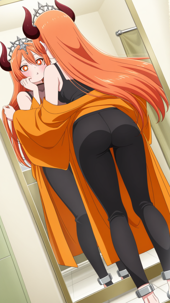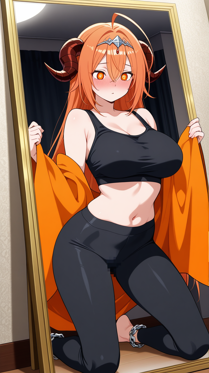 美少女,おっぱい,おしり,乳首,鏡,反射,鏡越し,,オレンジ髪のロングストレート、毛先は軽くウェーブ,深紅の瞳、垂れ目気味のハーフ目,巨乳・スレンダー,黒と深紅の和風タンクトップ、オレンジ色の短めの羽織、黒いレギンス、足首に銀色のチェーンアクセサリー、悪魔の角のヘッドアクセサリー,気の強いボーイッシュ、好戦的で頭の回転が速い