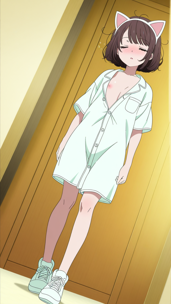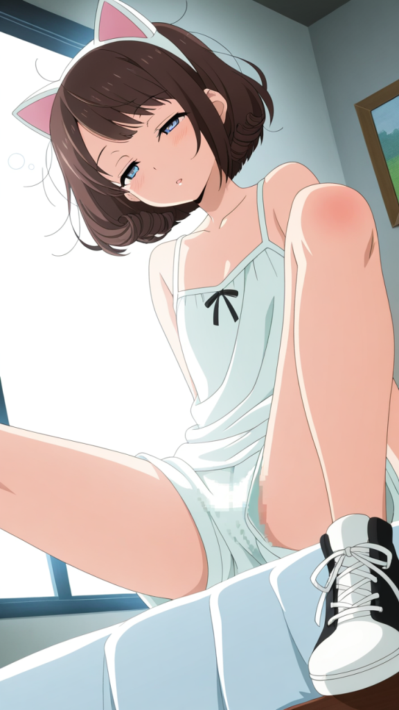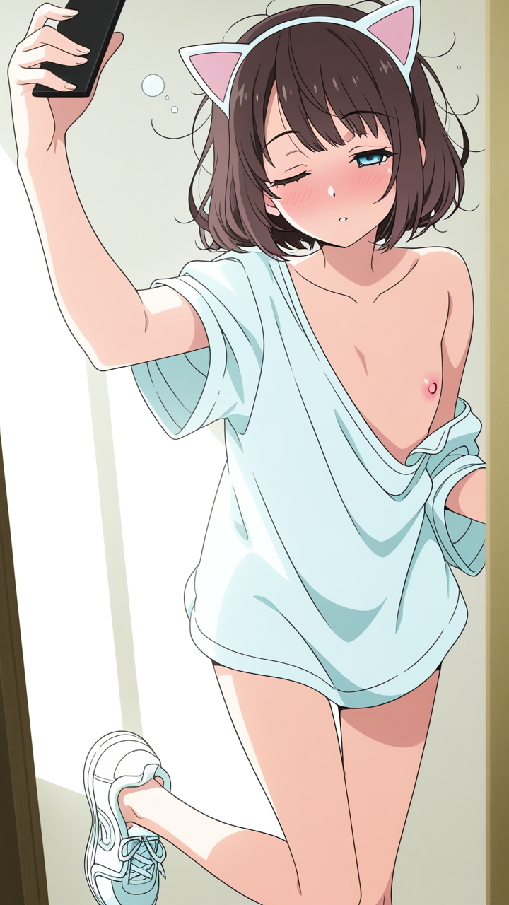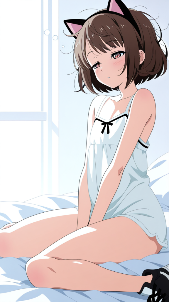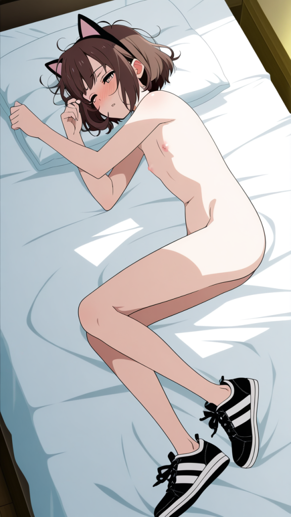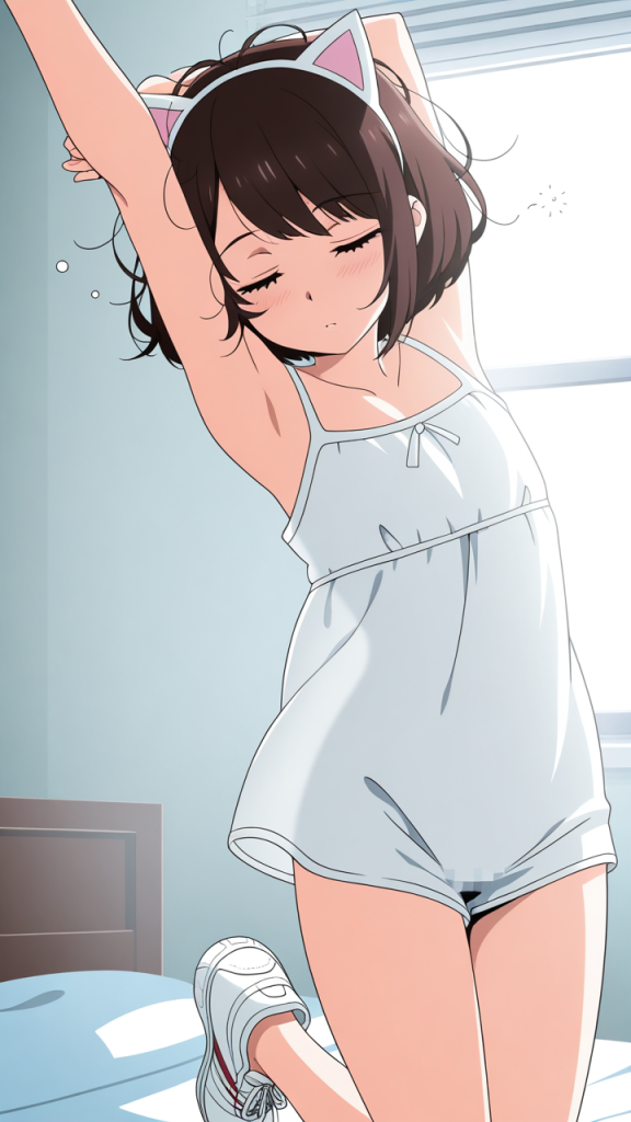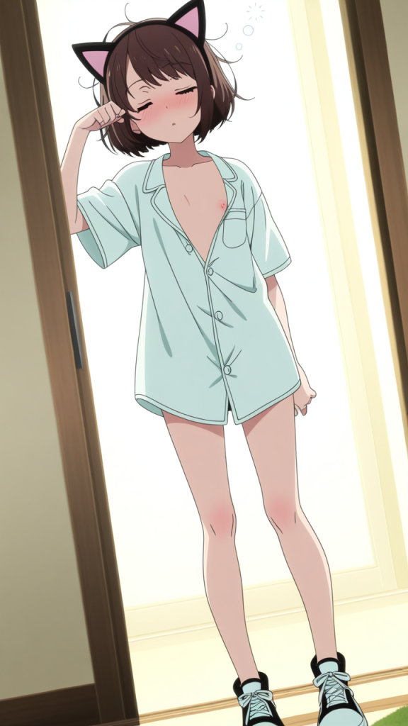 美少女,おっぱい,おしり,乳首,寝起き,パジャマ,朝,,茶髪のボブカット、毛先は内巻きにまとめたスタイル,銀色の瞳、垂れ目気味のハーフ目,貧乳・長身,黒と白のスポーツウェア上下、白いハイカットスニーカー、猫耳ヘッドアクセサリー,クール・無口・落ち着いた雰囲気