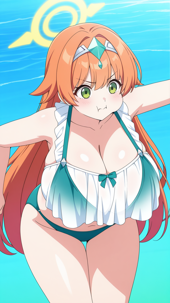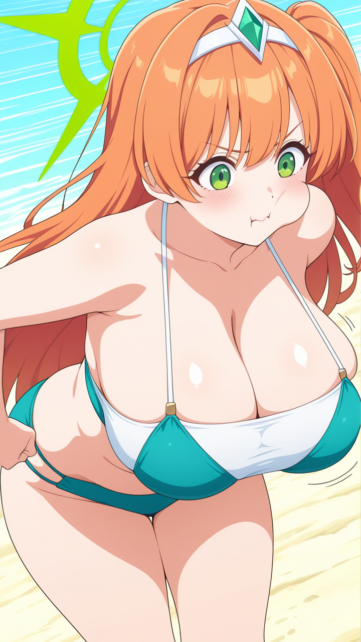 美少女,巨乳,おっぱい,乳首,爆乳,むっちり,,オレンジ髪のサイドテール、毛先は軽くウェーブ,翠色の切れ長の瞳,普通体型・少しむっちり,青と白のビキニ水着、天使の輪のヘッドアクセサリー,勝ち気で負けず嫌い、熱血的で競争心が強い