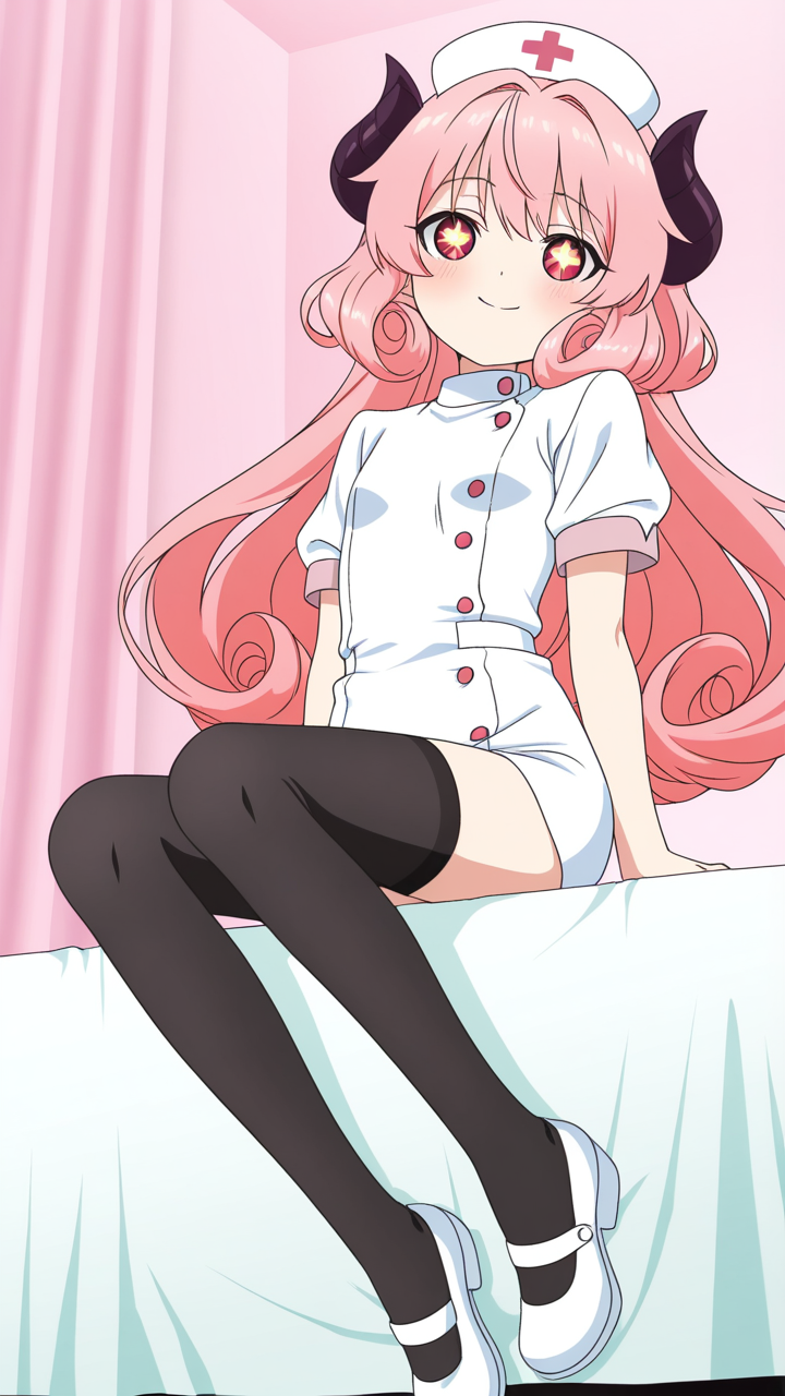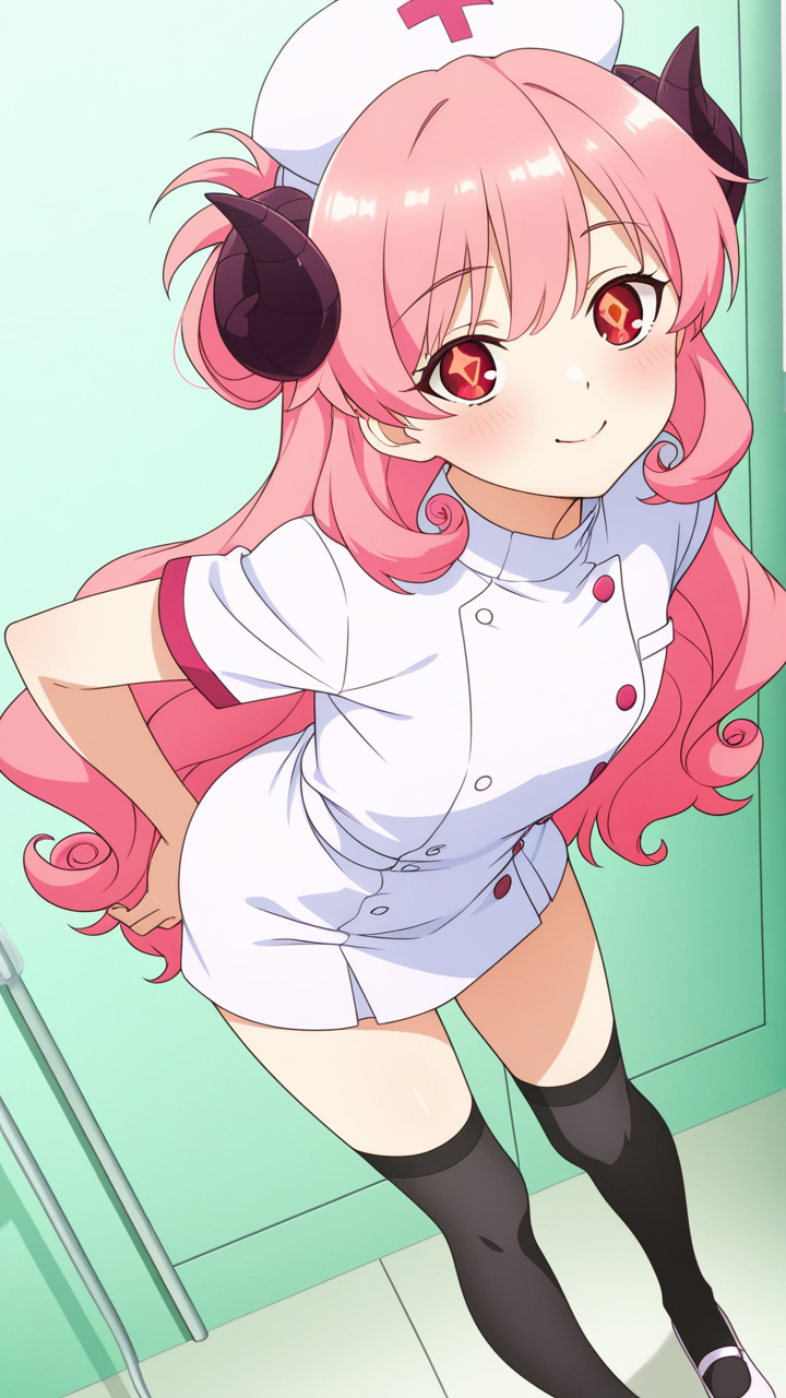 pink hair, half-up style with fluffy curled ends,red eyes, sharp almond-shaped eyes,petite chest, tall slender build,white and light pink nurse uniform, black thigh-high socks, white nursing shoes, demon horns headpiece,gentle healing type, calm and soothing demeanor, kind smile