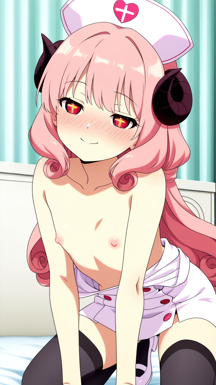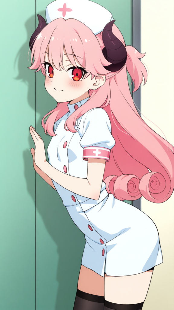 美少女,貧乳,おっぱい,乳首,微乳,ぺたんこ,スレンダー,,ピンク髪のハーフアップ、毛先ふんわり,赤い瞳、切れ長の目,貧乳・長身,白と薄紅のナース服、黒いニーハイソックス、白いナースシューズ、悪魔の角のヘッドアクセサリー,おっとり癒し系、優しい微笑み