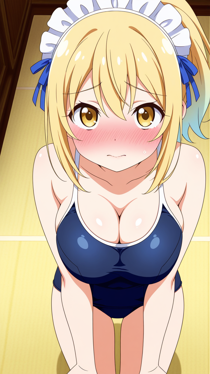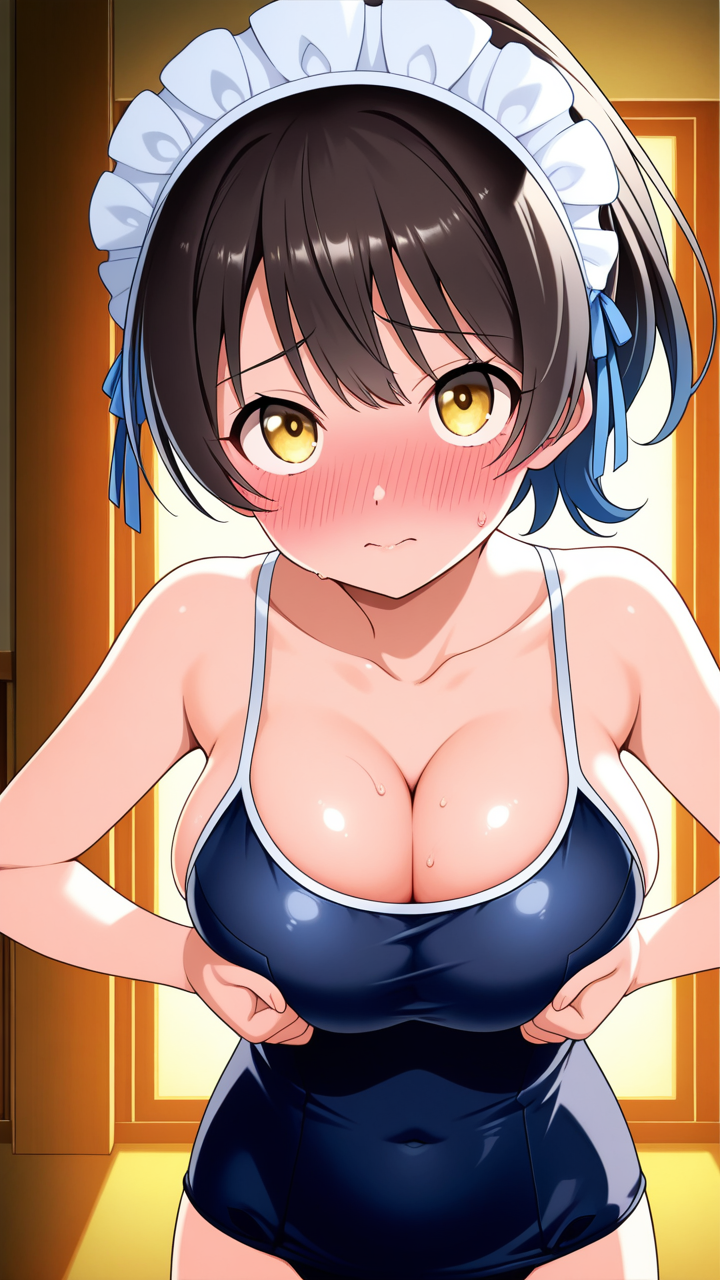 美少女,おっぱい,乳首,パイズリ,巨乳,乳挟み,,黒から青へのグラデーションポニーテール,金色の細めのクールな瞳,ロリ体型,紺と白のスクール水着、青いリボンヘッドドレス,恥ずかしがり屋で照れやすい