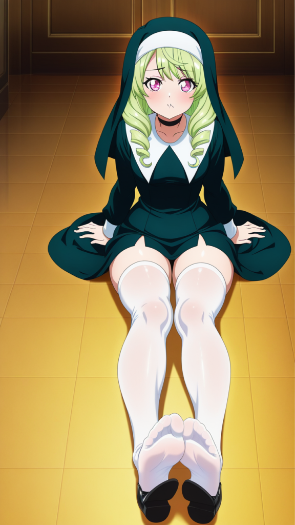 美少女,おっぱい,足コキ,足,脚,太もも,ニーソ,,ライム色の内巻きセミロング,ピンク色の丸くてキラキラした瞳,スポーティーで引き締まった筋肉質な体型,白と緑の修道女服、緑のロザリオ、黒いマリアシューズ、首元に黒いチョーカー,上品で気高いお嬢様気質だが、スポーティーな一面も持つ