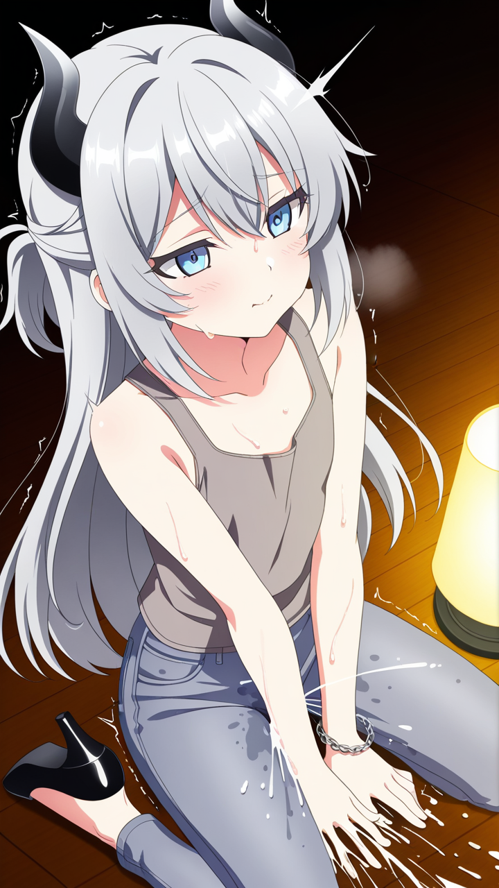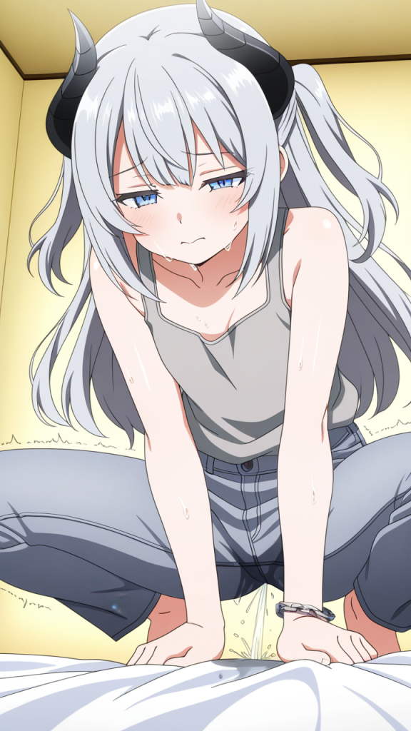 美少女,おっぱい,おしり,M字開脚,乳首,パンツ,くぱぁ,潮吹き,イキ潮,女性射精,びしょ濡れ,,シルバーグレーのハーフアップ、毛先は軽くウェーブ,青い瞳、垂れ目気味のハーフ目,貧乳・小柄,薄紫のカジュアルジーンズ、グレーのタンクトップ、黒い悪魔の角のヘッドアクセサリー、手首に銀色のチェーンブレスレット,ミステリアス、どこか儚げで秘密を秘めた雰囲気