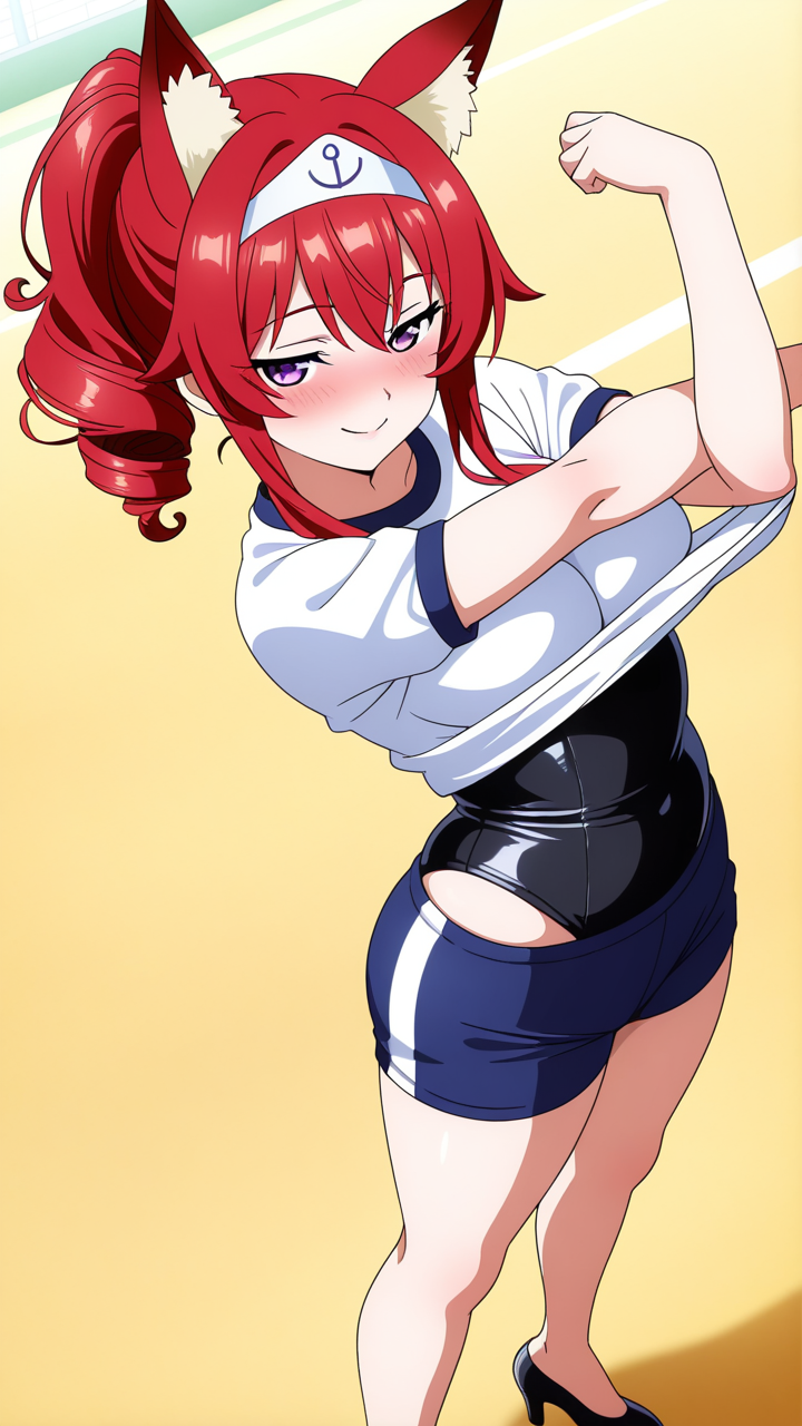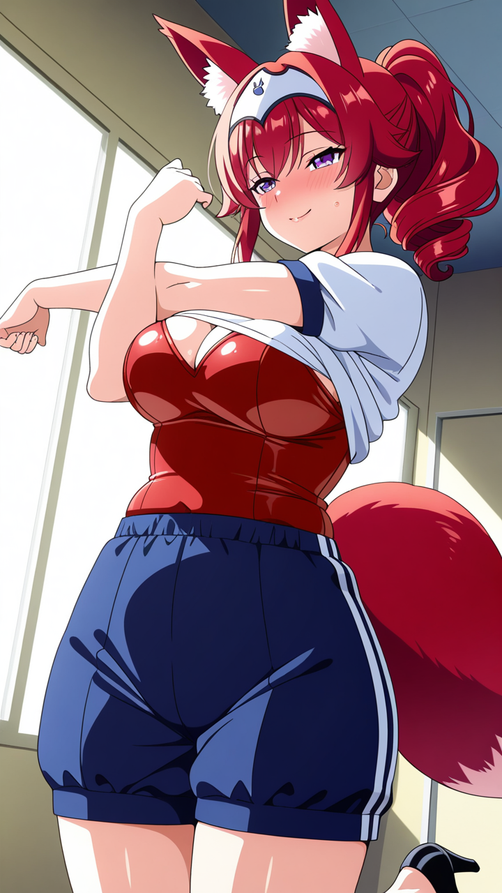 美少女,おっぱい,おしり,体操服,ブルマ,体育,,赤髪ポニーテール、毛先ふんわりカール,紫の瞳、細めでクールな目,巨乳、むっちりとした体型,黒と深紅のバニースーツ、狐耳ヘッドアクセサリー、黒いハイヒール,腹黒系、計算高く甘い笑顔で相手を誘惑する