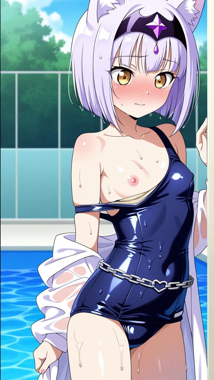 美少女,おっぱい,おしり,スク水,スクール水着,水着,,マゼンタ色の外ハネボブ,金色の瞳、つり目,ロリ体型,紫と白の魔法少女衣装、狐耳ヘッドアクセサリー、白いマニキュア、腰に銀色のチェーンベルト,クール・無口・ミステリアス