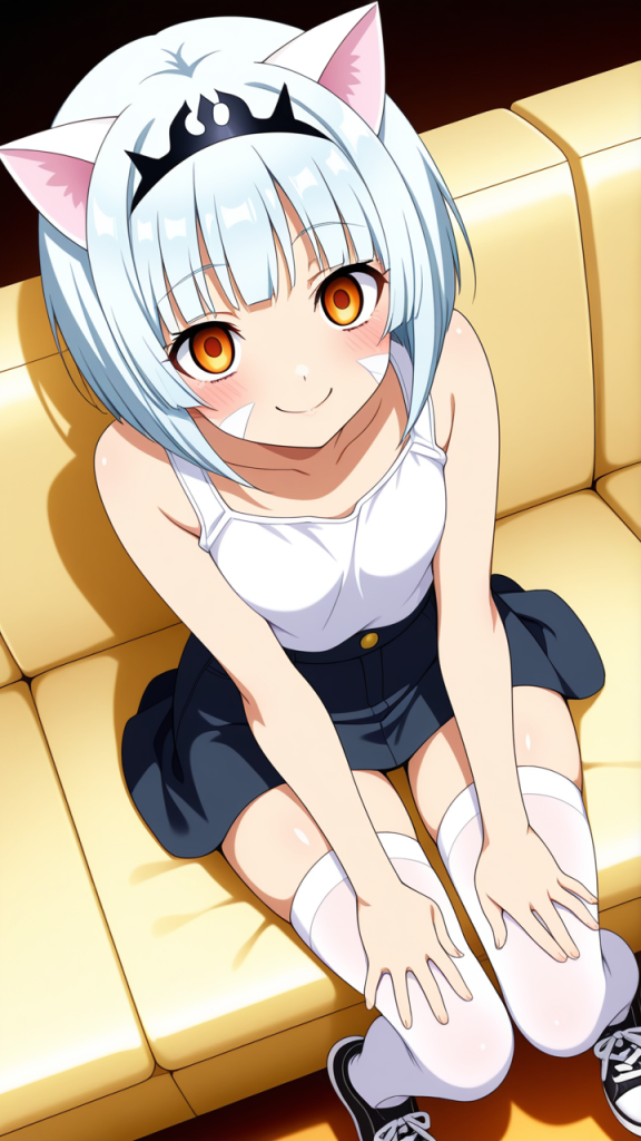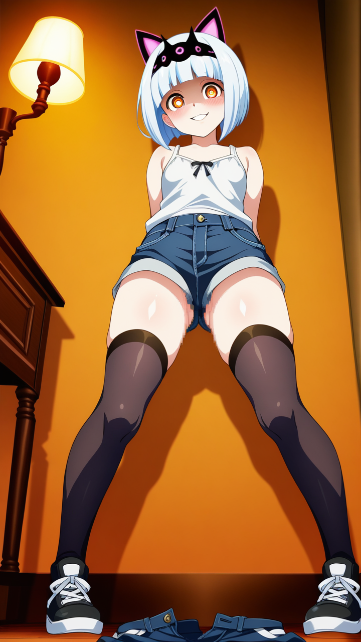 美少女,おっぱい,おしり,ニーソ,絶対領域,太もも,,白髪のボブカット、毛先は内巻き,琥珀色の大きなぱっちり目,小柄でむっちりとした体型,黒いカジュアルジーンズ、白いタンクトップ、白い猫耳ヘッドアクセサリー、黒いスニーカー,ヤンデレ気味で執着心が強く、好きな相手には独占欲が強い。笑顔の裏に危険性を秘めている