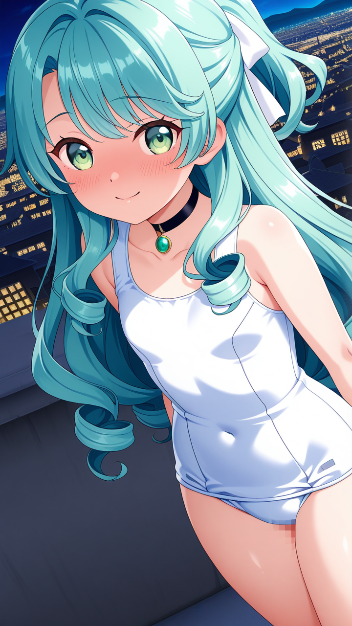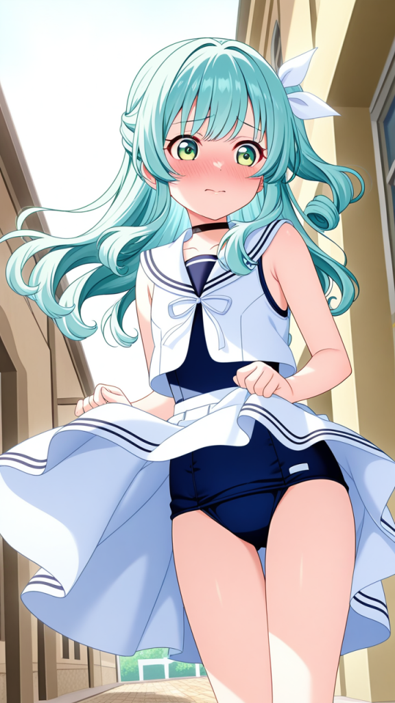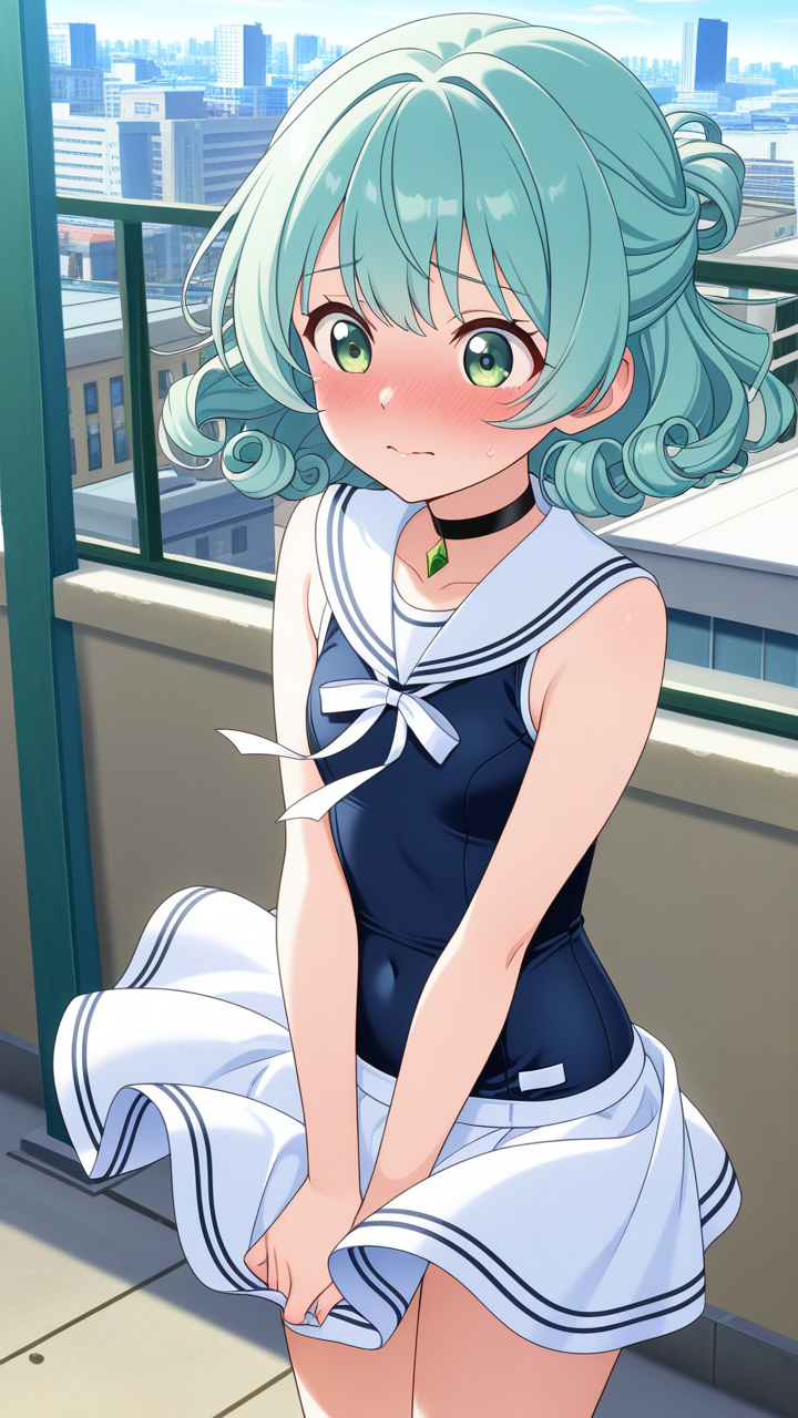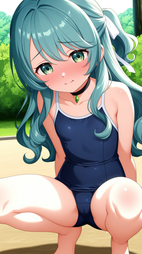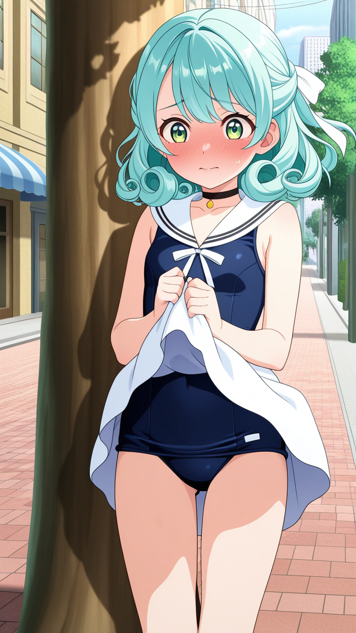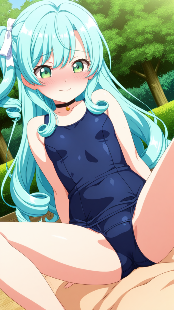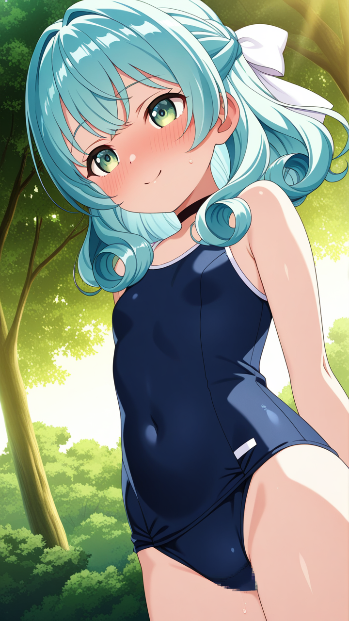 美少女,おっぱい,おしり,乳首,野外露出,露出,屋外,,青髪のハーフアップ、毛先ふんわりカール,翠色の瞳、ハーフっぽい二重,ロリ体型,紺と白のスクール水着、首元に黒いチョーカー、白いリボン,元気系、いたずら好き
