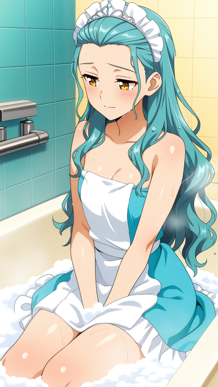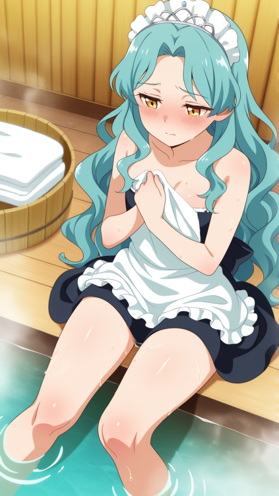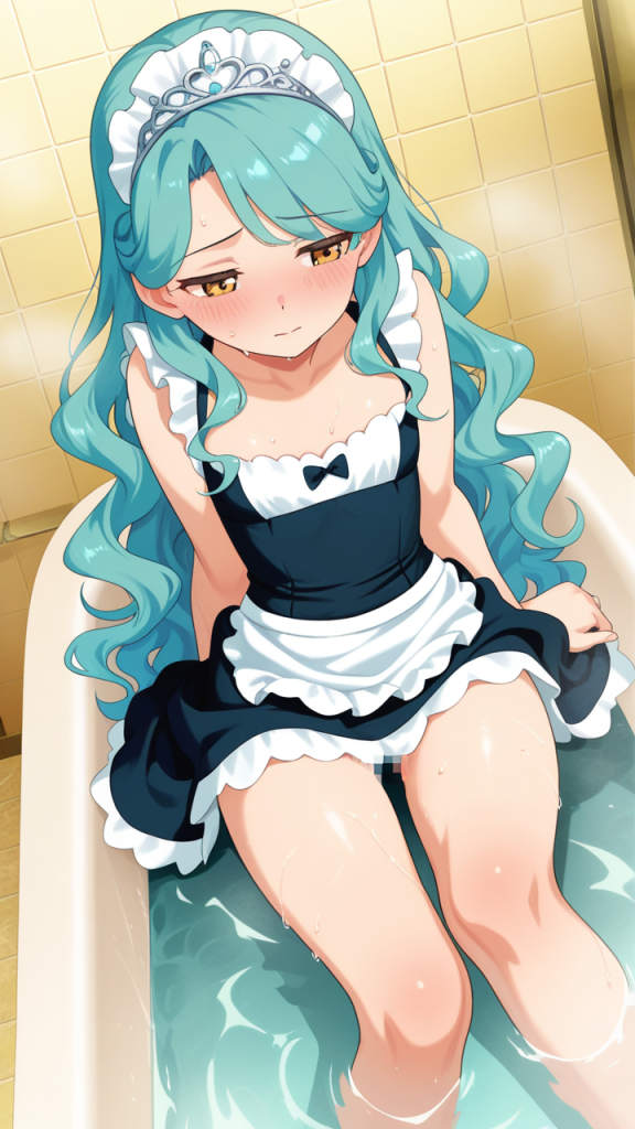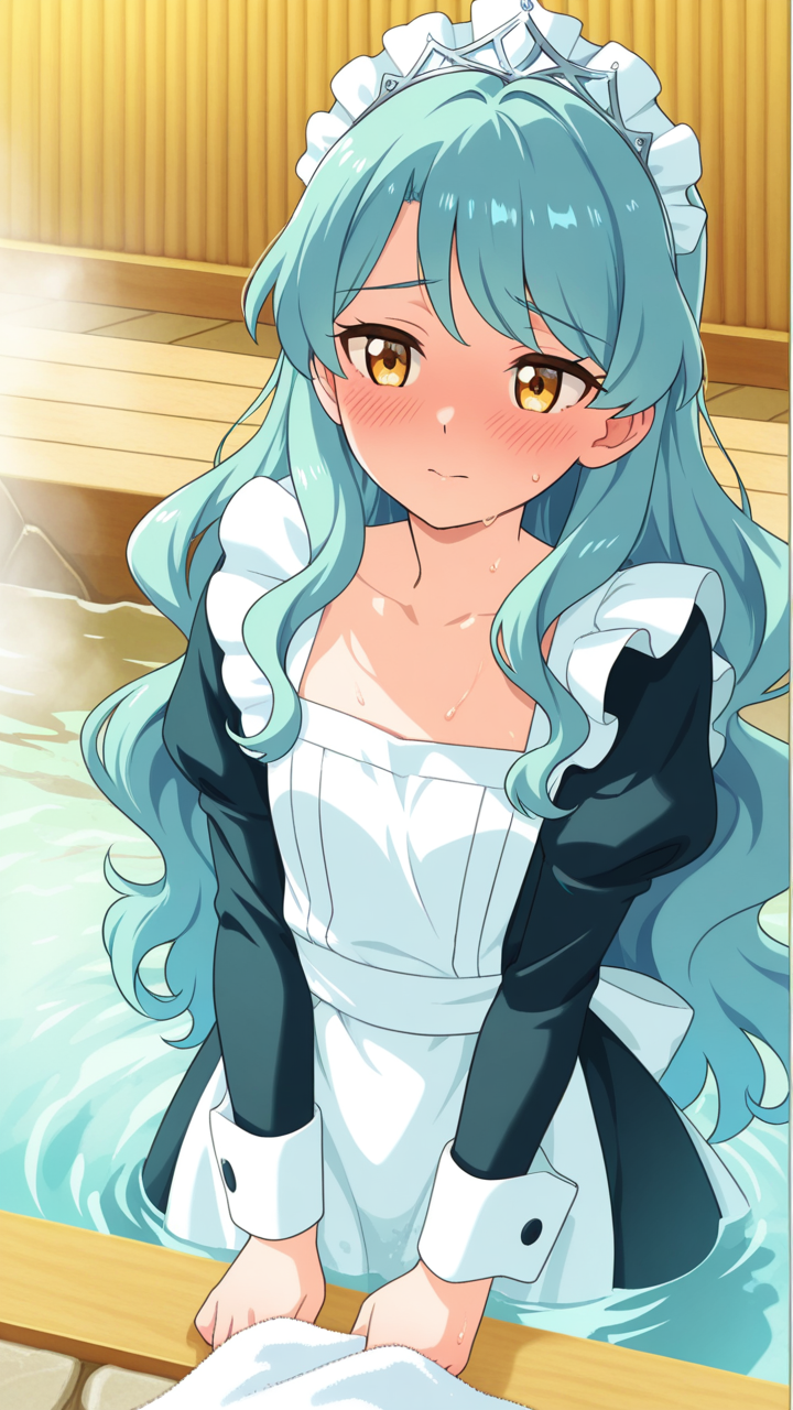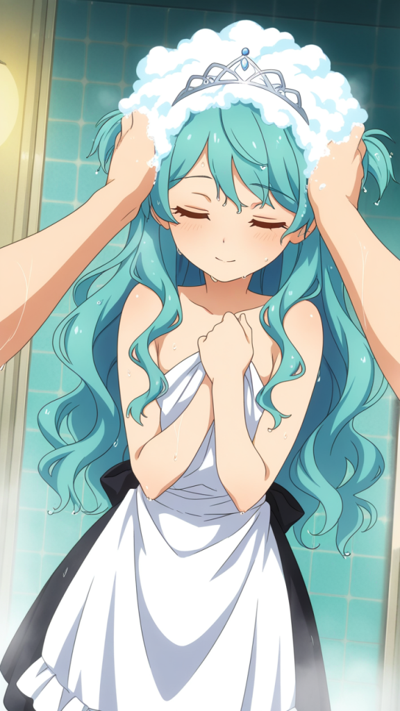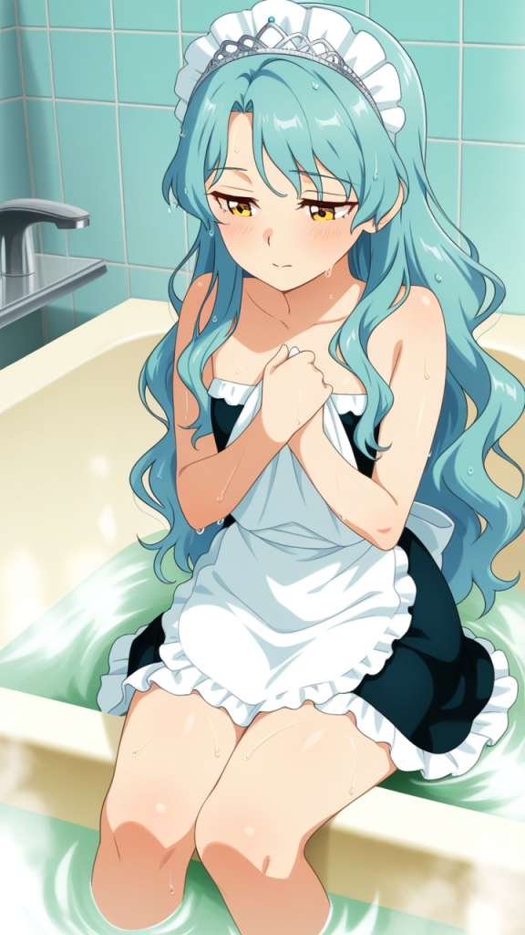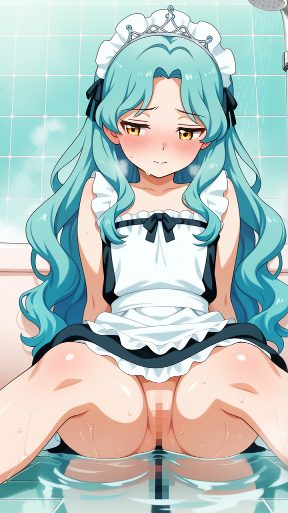 美少女,おっぱい,おしり,乳首,風呂,入浴,温泉,シャワー,,水色髪のウェーブロング,金色の瞳、ハーフっぽい二重,小柄でむっちりした体型,黒と水色のメイド服、シルバーのティアラ型ヘッドドレス、黒いメイドヘッドドレス、白いエプロン,おっとり癒し系、優しく穏やかで包容力がある