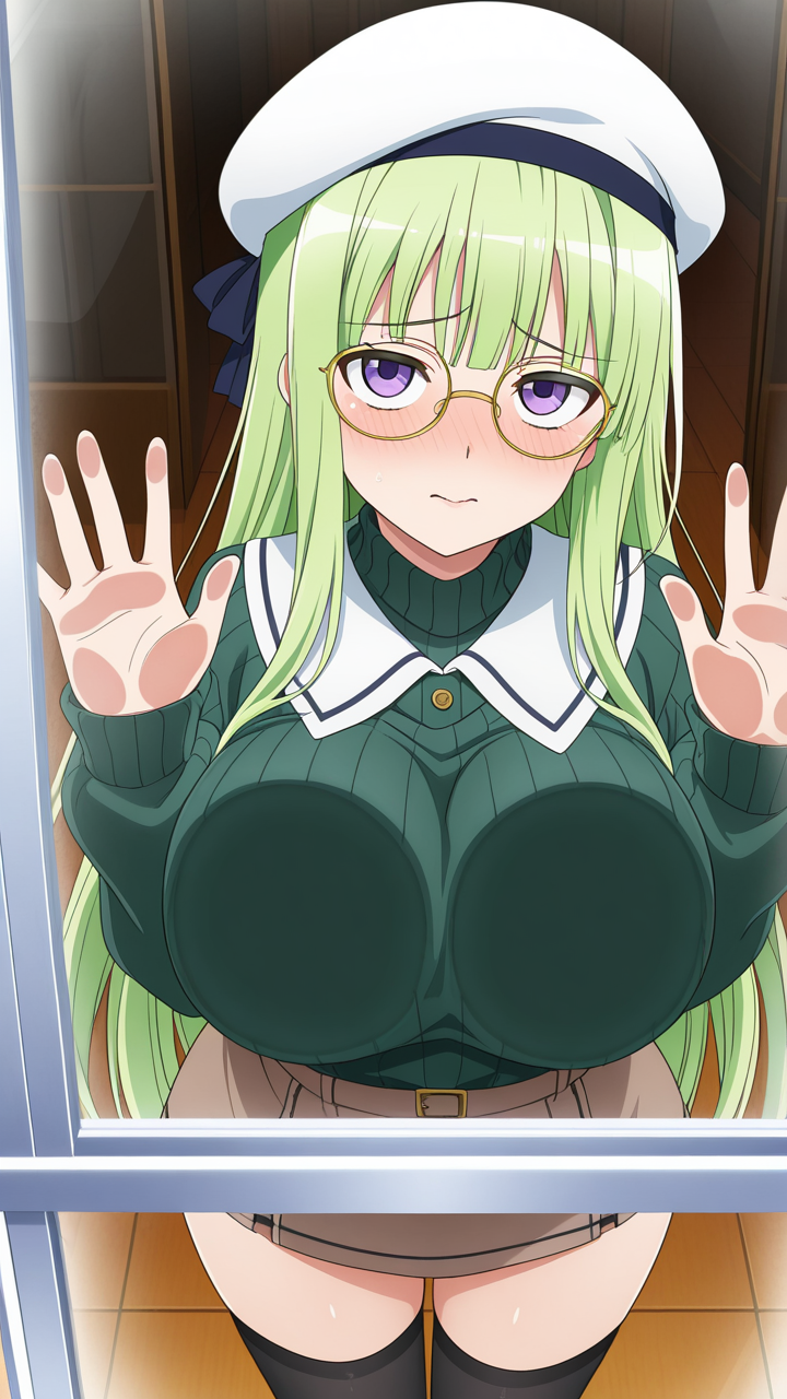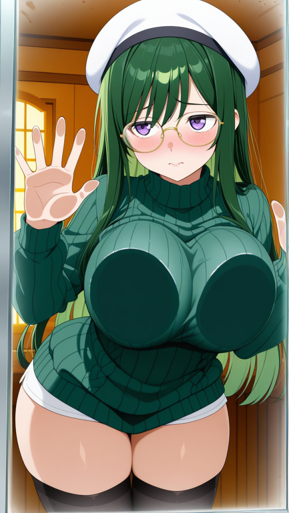 美少女,おっぱい,乳首,ガラス,押し付け,圧迫,胸,巨乳,貧乳,,緑髪ロングストレート,紫の瞳つり目,巨乳むっちり体型,濃緑色ニットセーター、黒ニーソックス、金色フレーム眼鏡、白いベレー帽,恥ずかしがり屋で控えめ