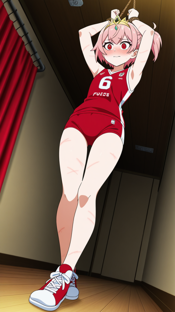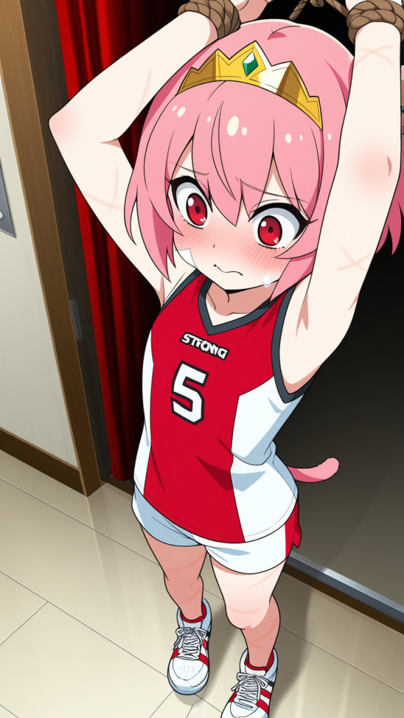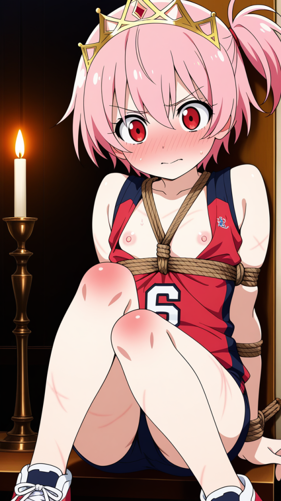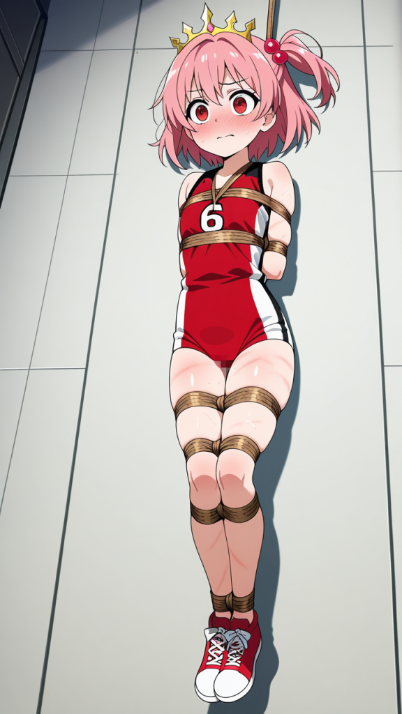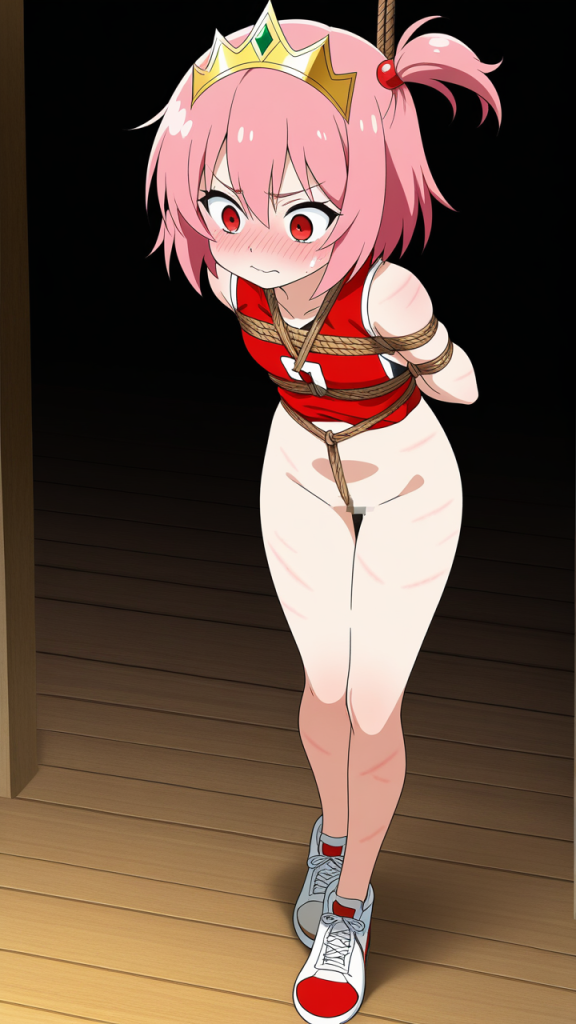 美少女,おっぱい,おしり,乳首,縛り,ロープ,拘束,SM,ボンデージ,,ピンク髪のサイドテール、毛先は軽くウェーブ,赤い瞳、切れ長の目,貧乳・長身,黒と赤のスポーツジャージ、白いハイカットスニーカー、頭に金色のティアラ型ヘッドドレス,気の強いボーイッシュ、元気で戦闘的