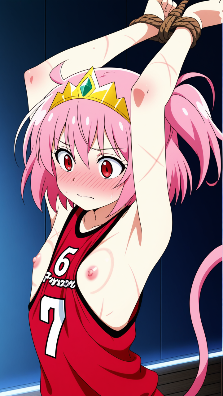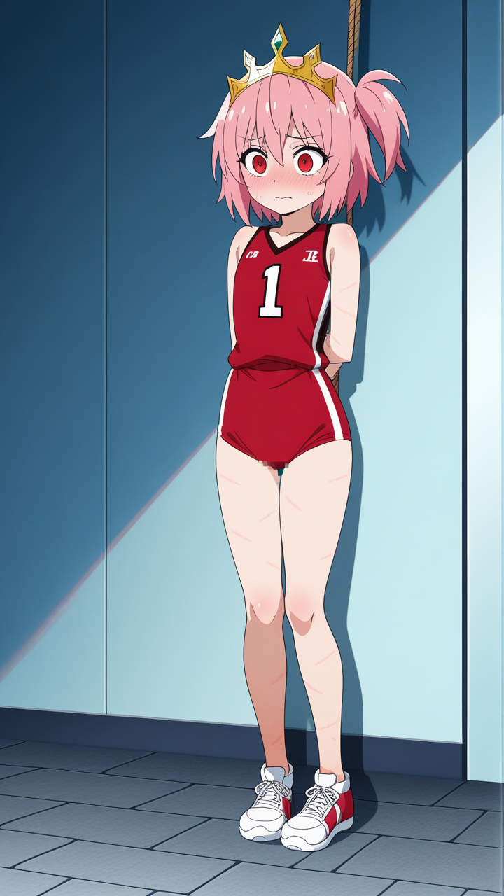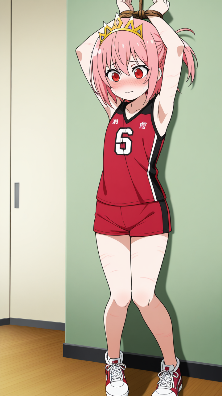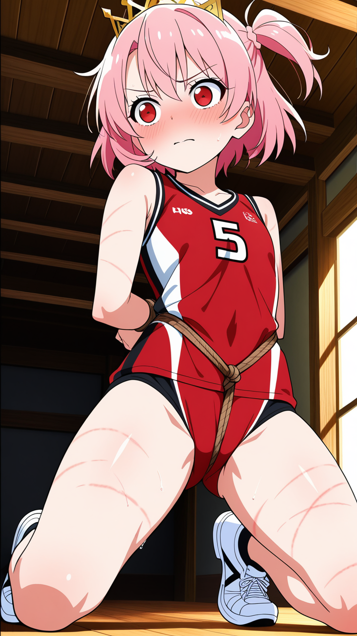 美少女,おっぱい,おしり,乳首,縛り,ロープ,拘束,SM,ボンデージ,,ピンク髪のサイドテール、毛先は軽くウェーブ,赤い瞳、切れ長の目,貧乳・長身,黒と赤のスポーツジャージ、白いハイカットスニーカー、頭に金色のティアラ型ヘッドドレス,気の強いボーイッシュ、元気で戦闘的
