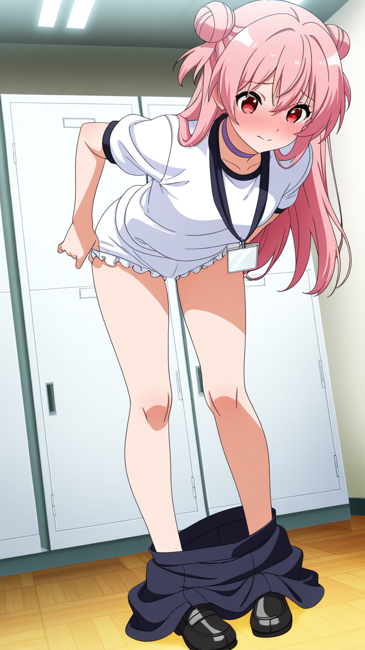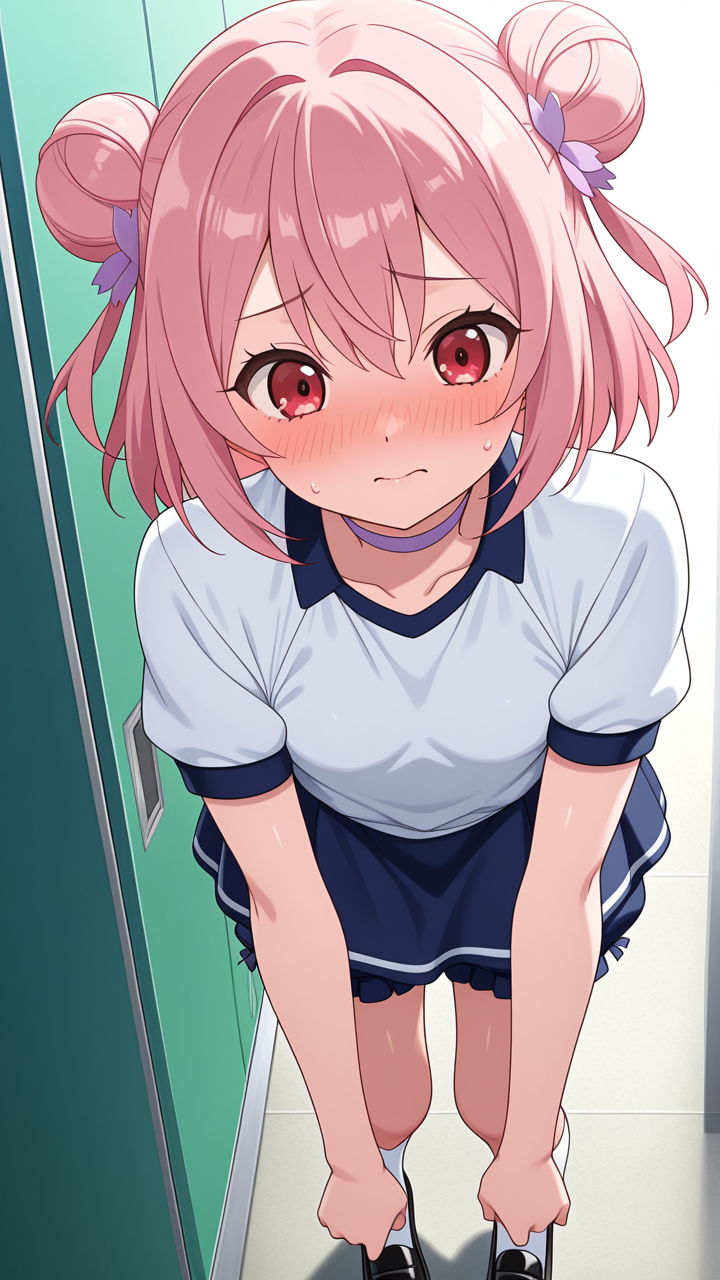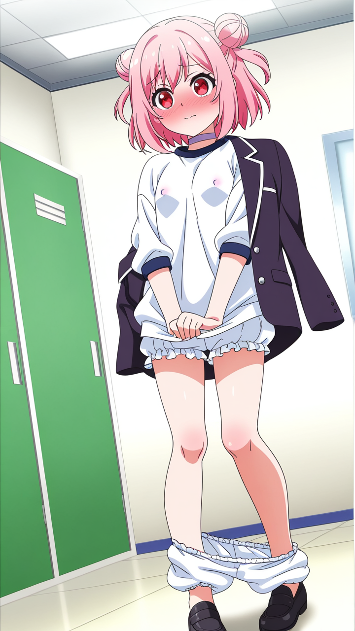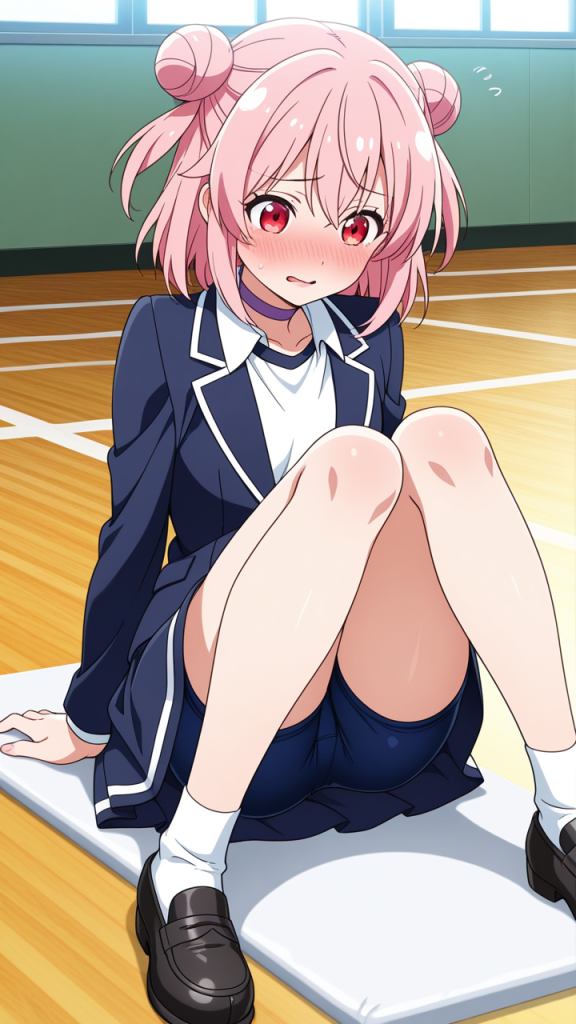 美少女,おっぱい,おしり,体操服,ブルマ,体育,,桜色のお団子ヘア,赤い瞳のハーフっぽい二重,背が高くスレンダー,黒と白のビジネスブレザー、白いシャツ、黒いタイト膝丈スカート、黒いローファー、首元に薄紫のチョーカー,気の強いボーイッシュ、自信家で男勝り